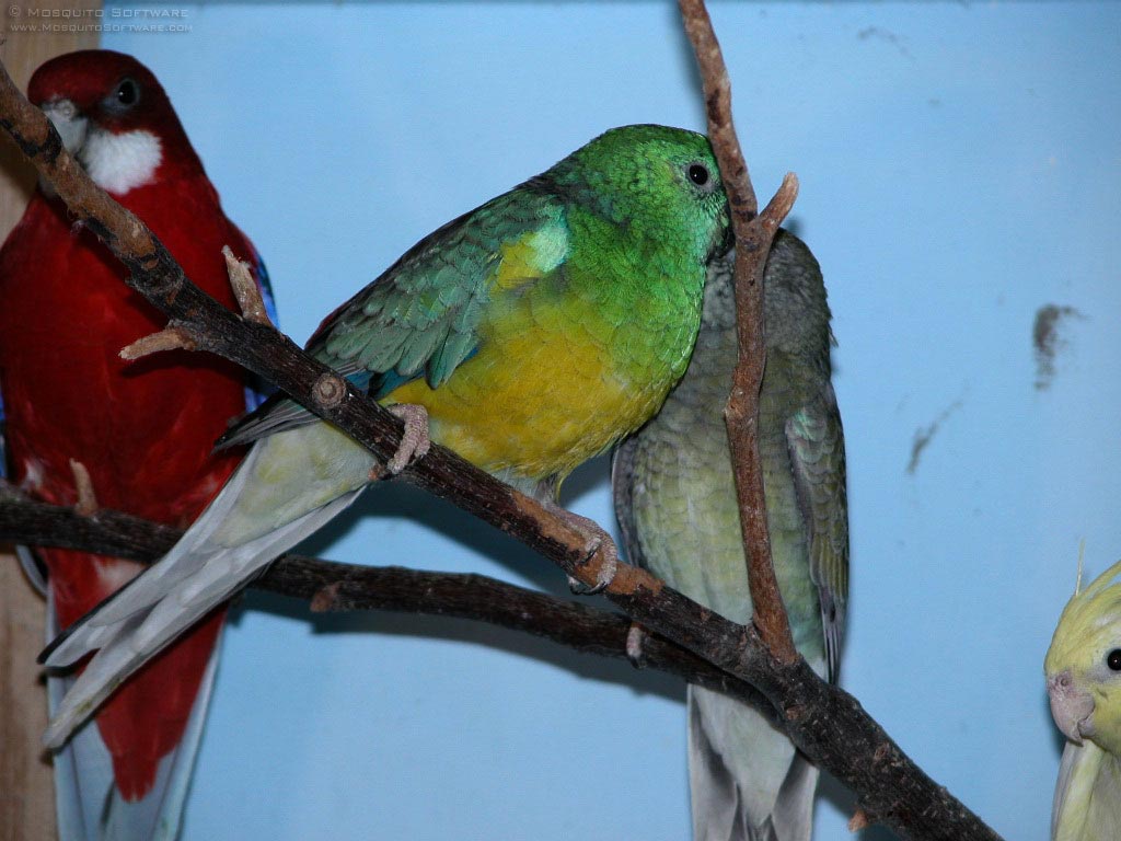 Description: Two colorful birds perched on a branch of a tree in a room with blue walls and a blue wall.