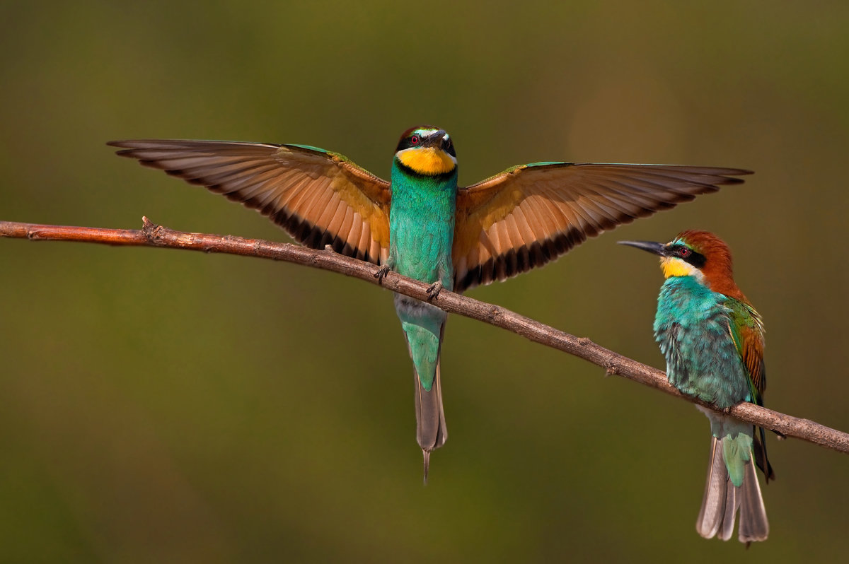 Description: Two colorful birds perched on a branch with wings spread out and one bird with its wings spread out.