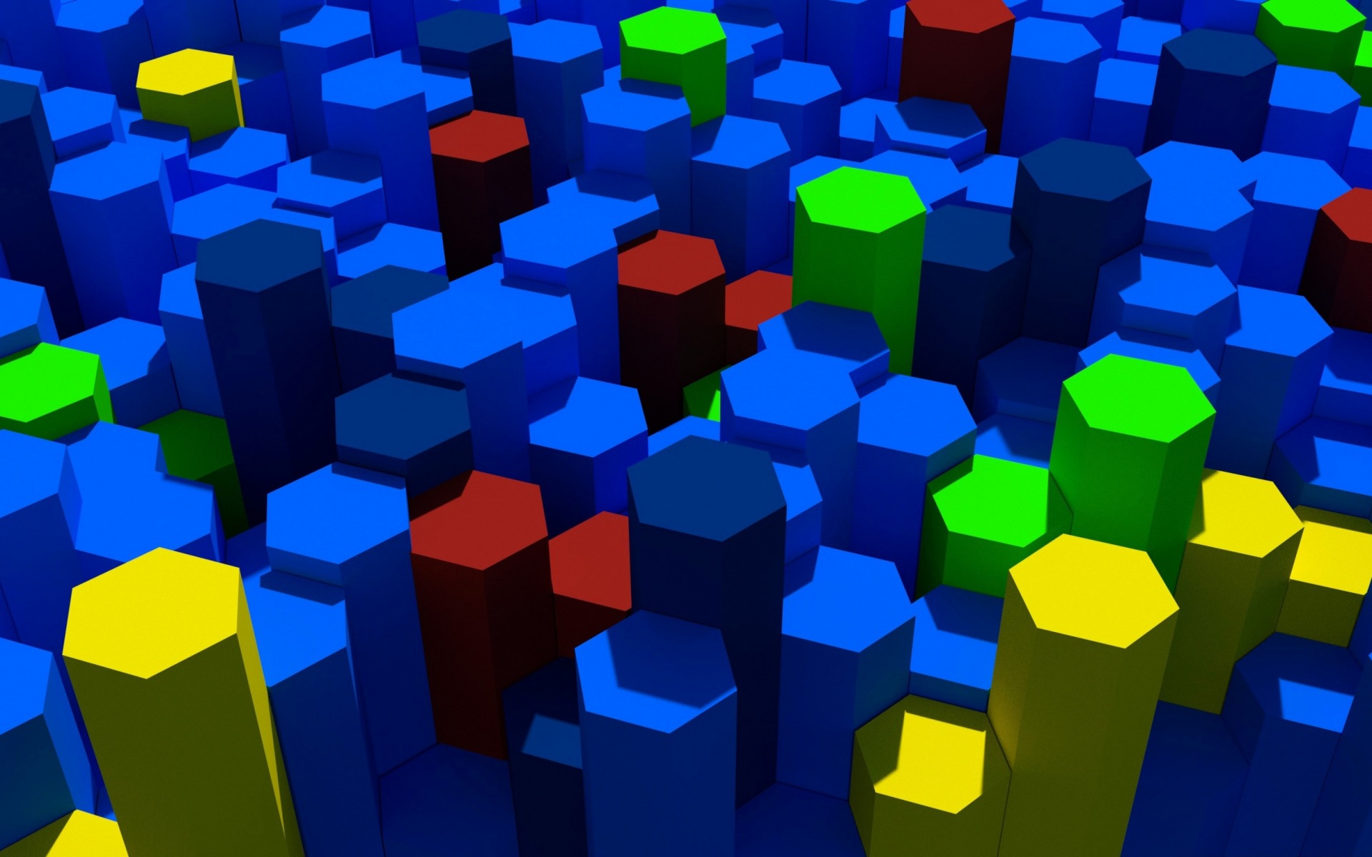 Description: A large group of colorful blocks in a room with a red one in the middle of the room and a green one in the middle.
