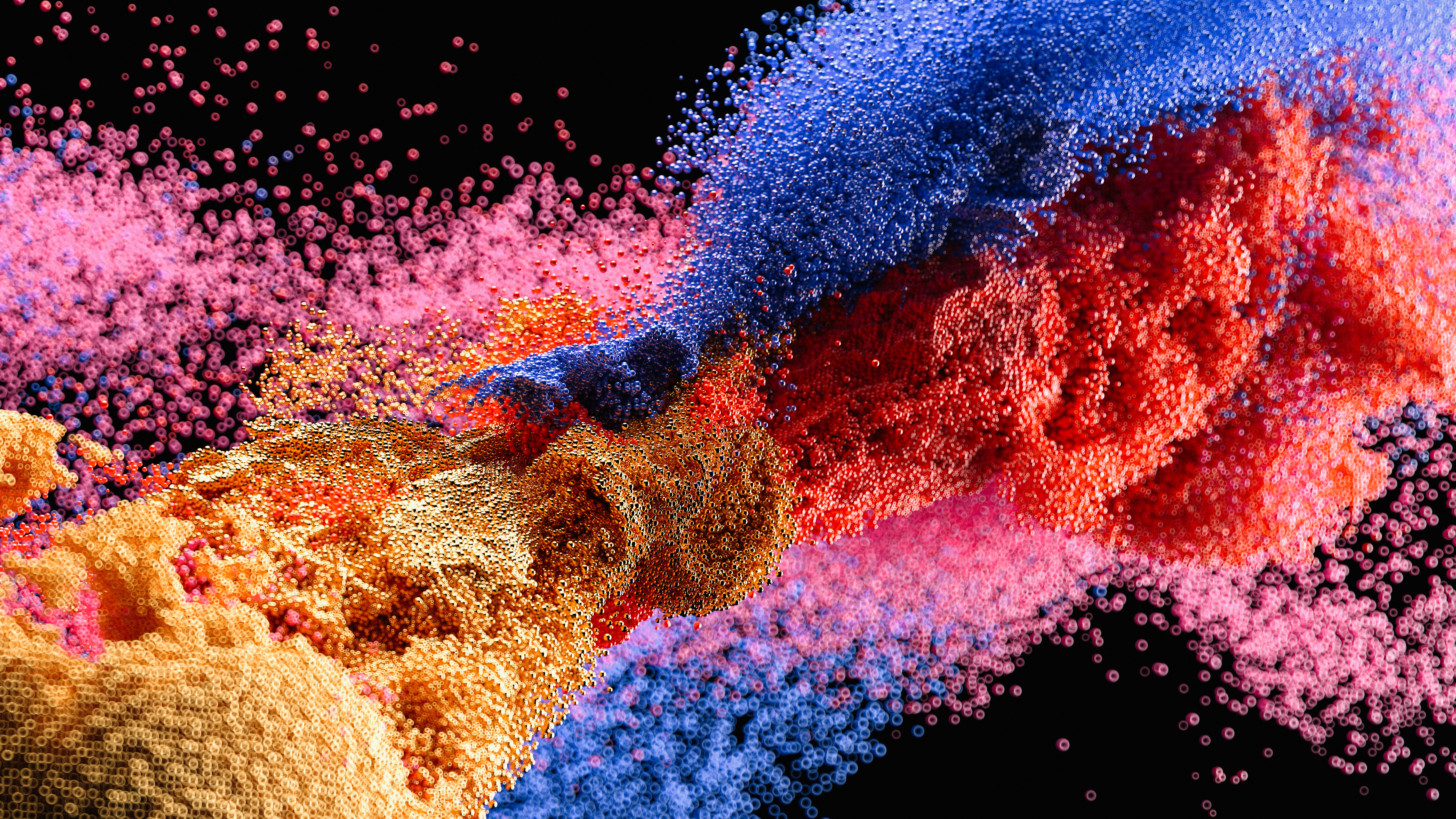Description: A colorful object is being blown by a blower with colored powder sprinkles on it and a black background.