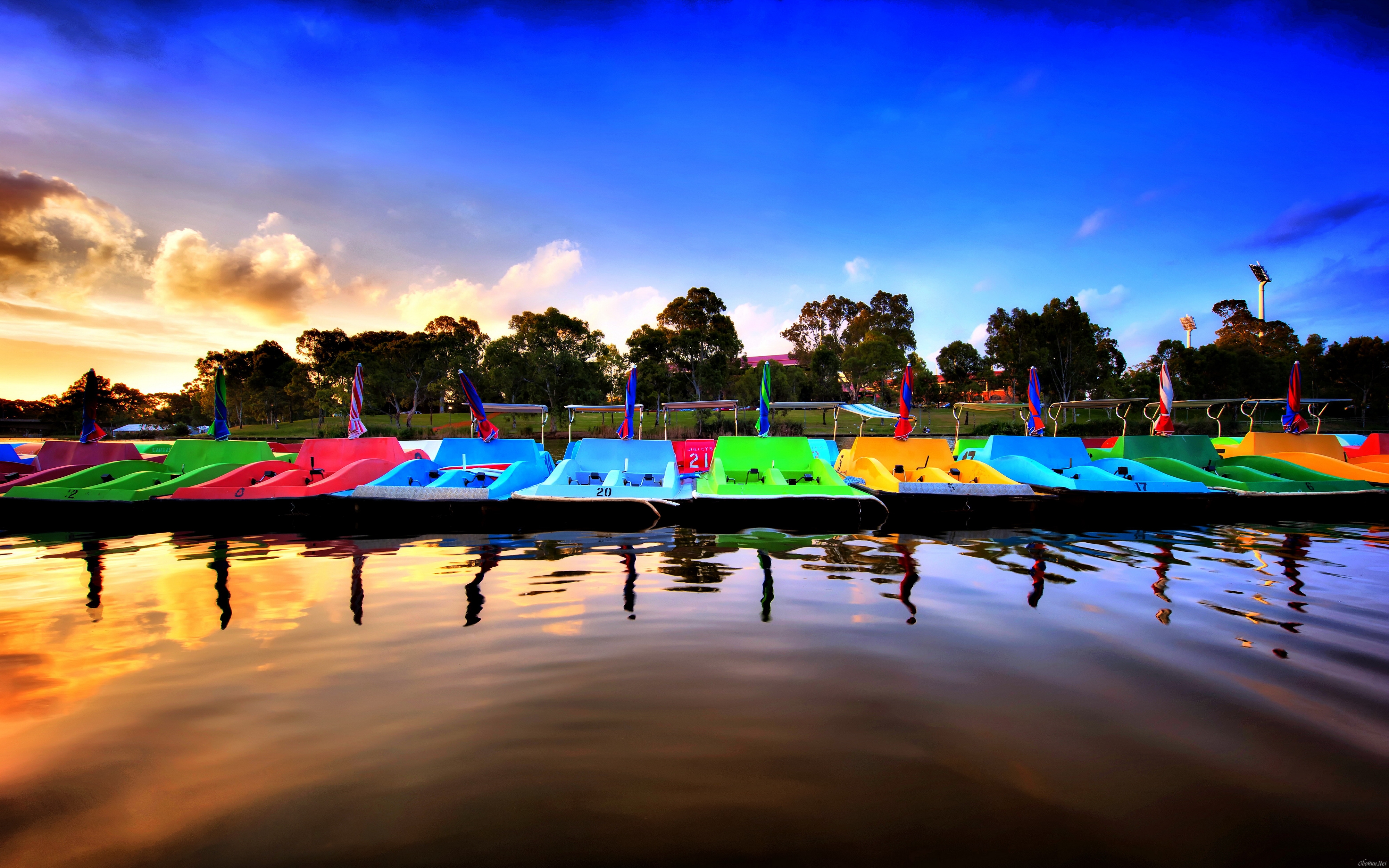 Description: A row of colorful boats sitting on top of a lake next to a forest at sunset or dawn with clouds.