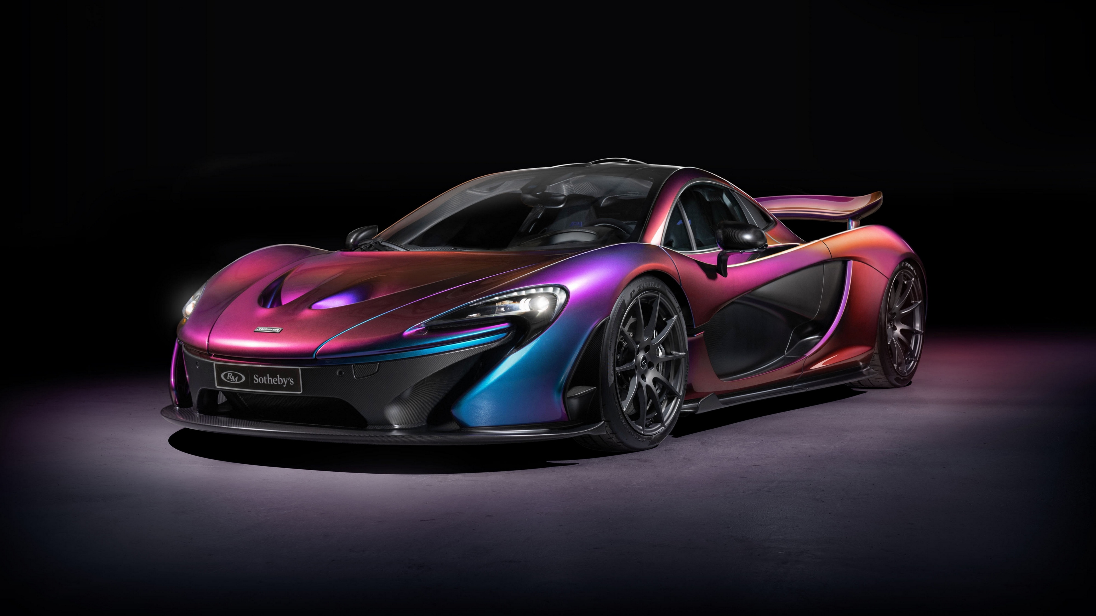 Description: A colorful car is shown in a dark room with a black background and a black background behind it.
