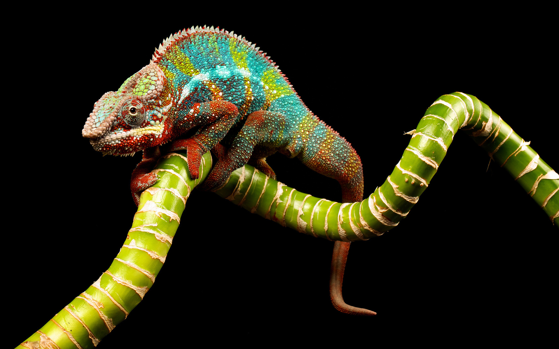Description: A colorful chamelon sitting on a branch with its tail curled up and its head turned to the side.