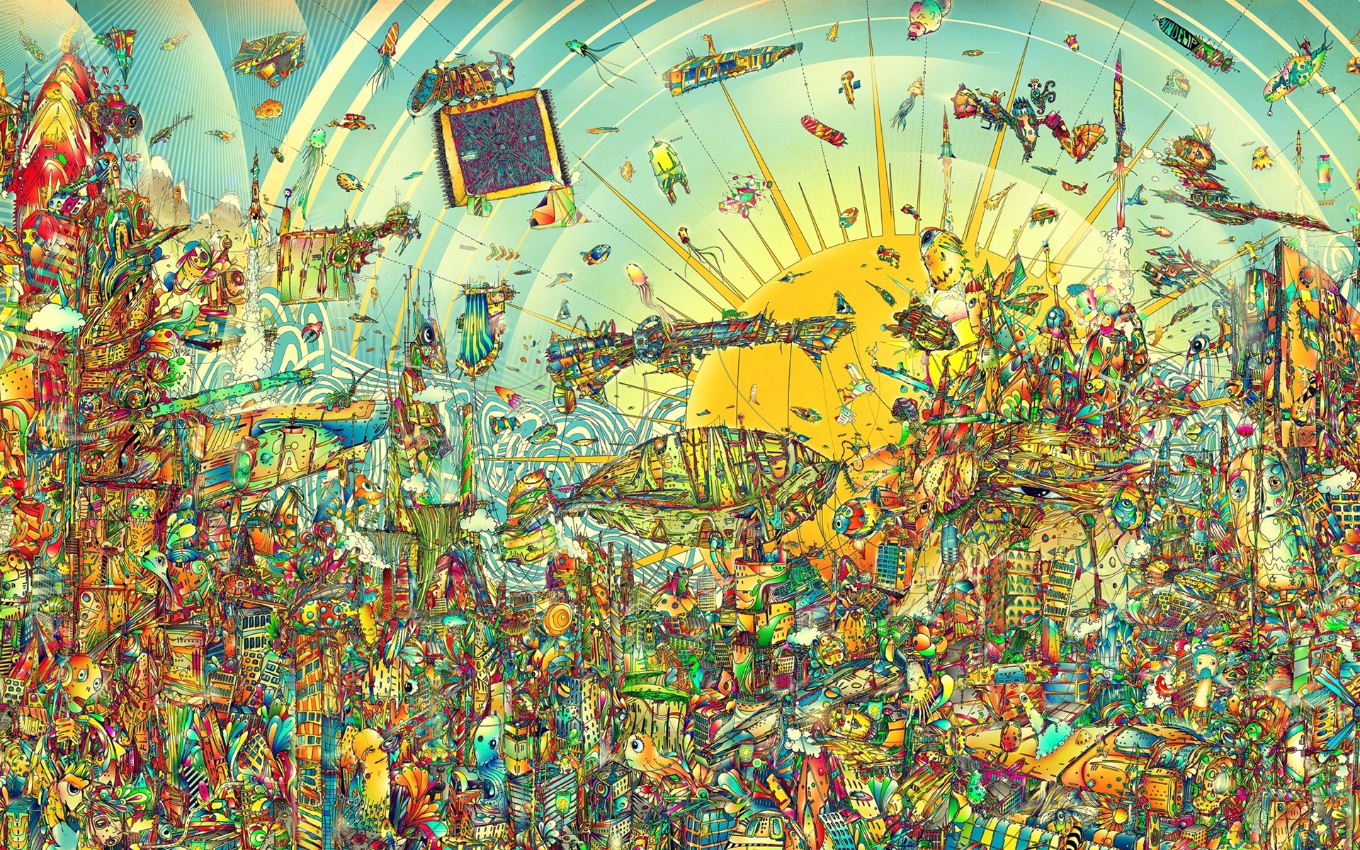 Description: A painting of a city with lots of colorful objects in it and a sun in the background with a blue sky.