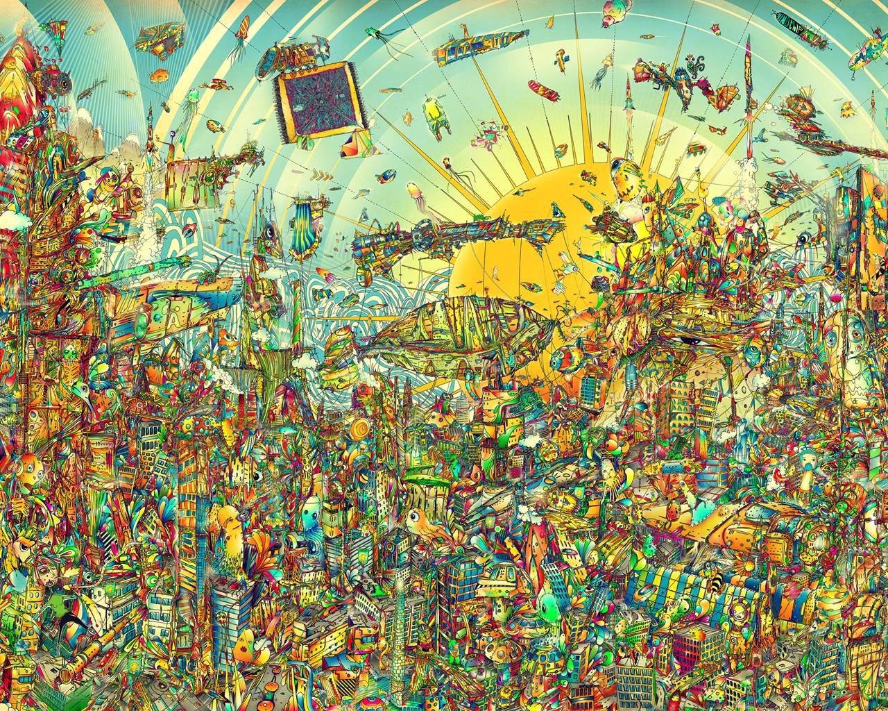 Description: A painting of a city with lots of colorful objects in it and a sun in the sky above it.