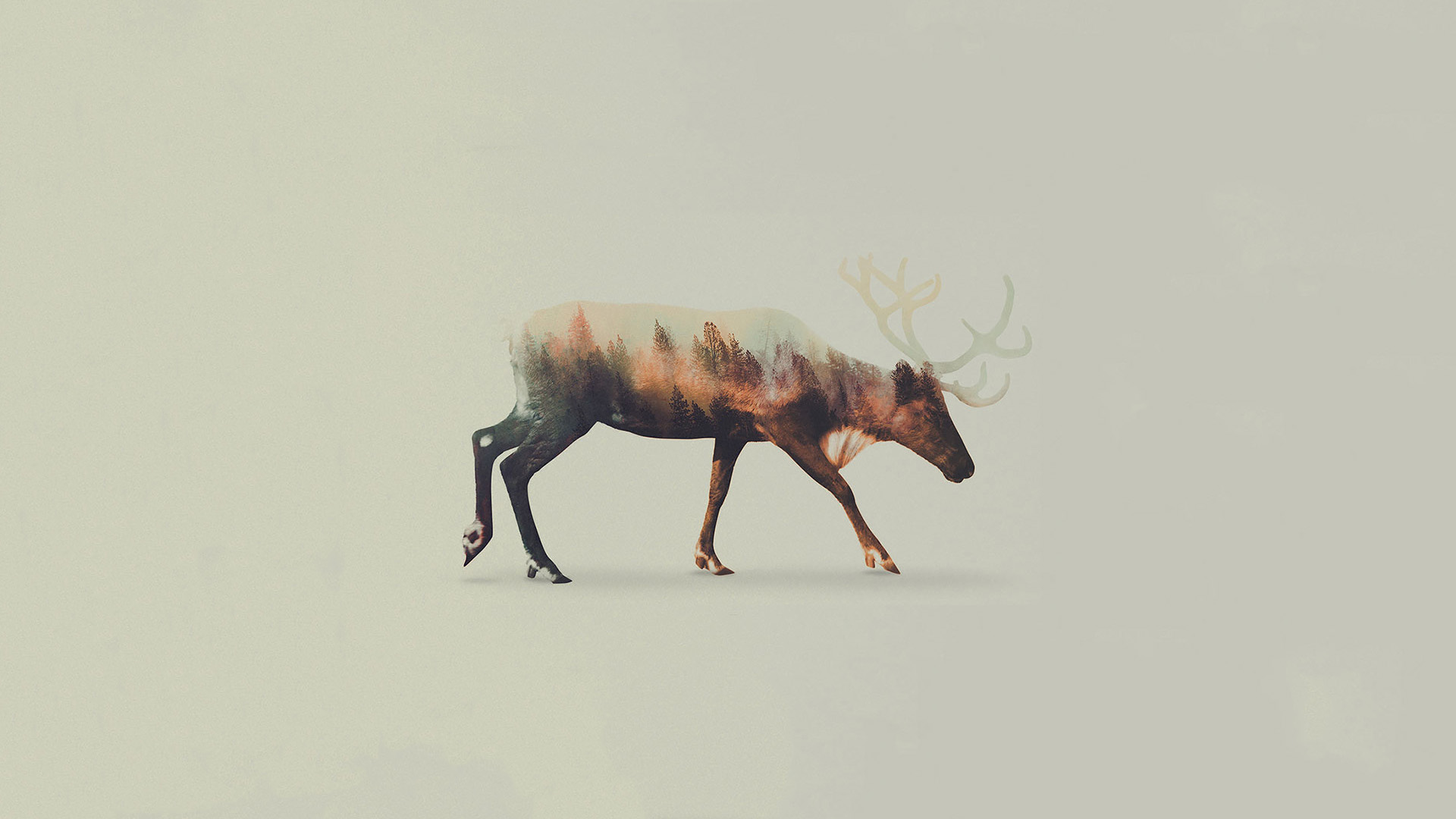 Description: A deer with a lot of colors on it's body walking across a white background with a deer's head in the middle.