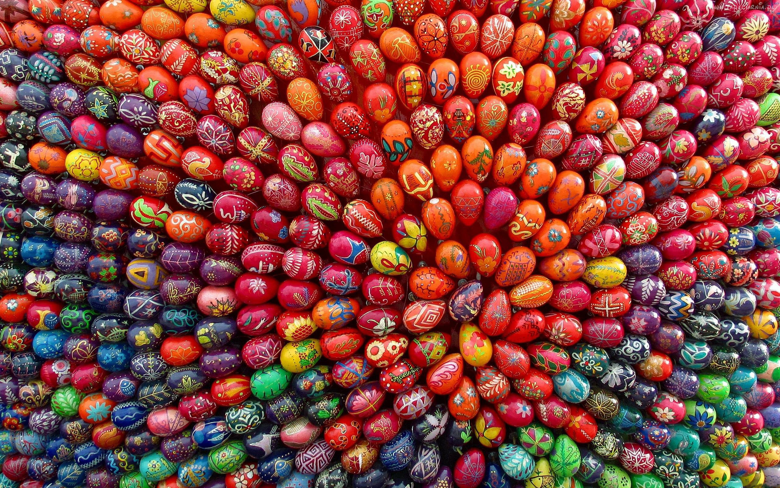 Description: A colorful display of eggs in a large circle shape with a pattern of smaller eggs in the center of the image.