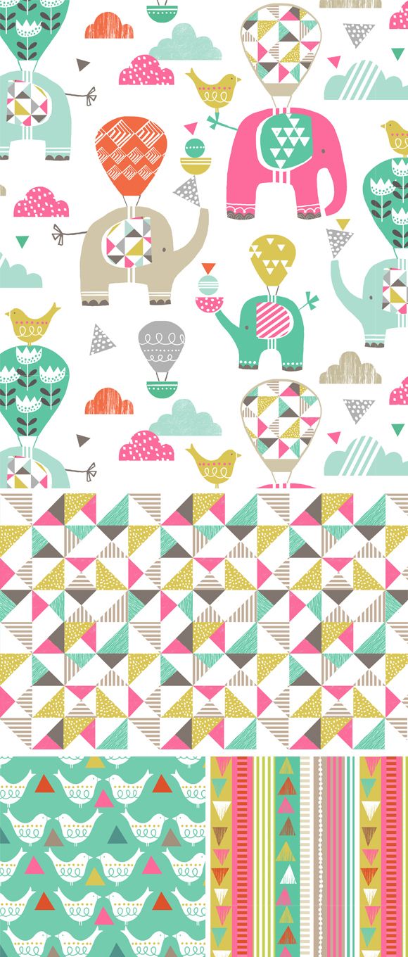 Description: A colorful pattern with elephants and hearts on it's sides and a bird on the other side of the pattern.