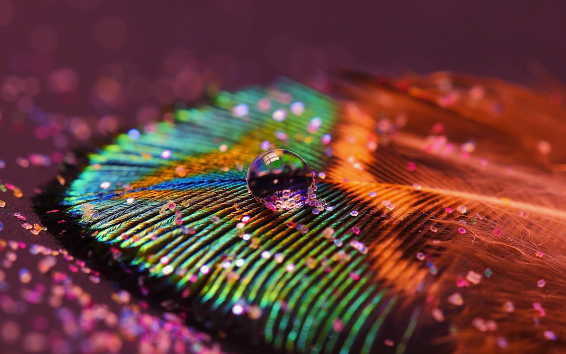 Description: A close up of a colorful feather with a drop of water on it's side and a purple background.