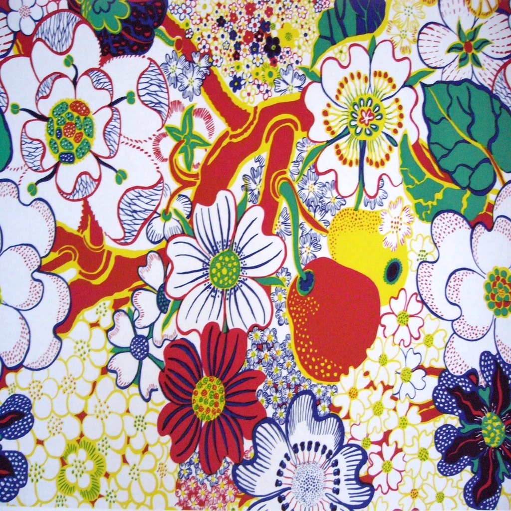 Description: A colorful floral print on a white background with red.