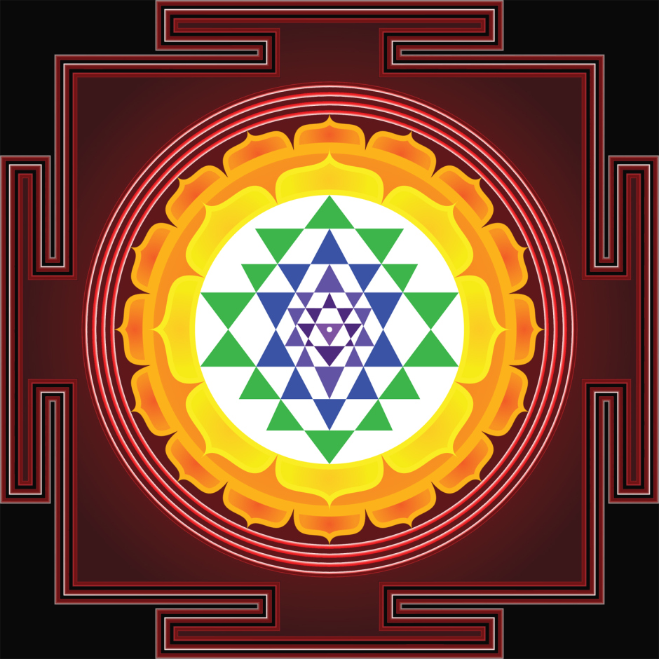 Description: A colorful flower with a star in the middle of it on a red background with a gold border around it.