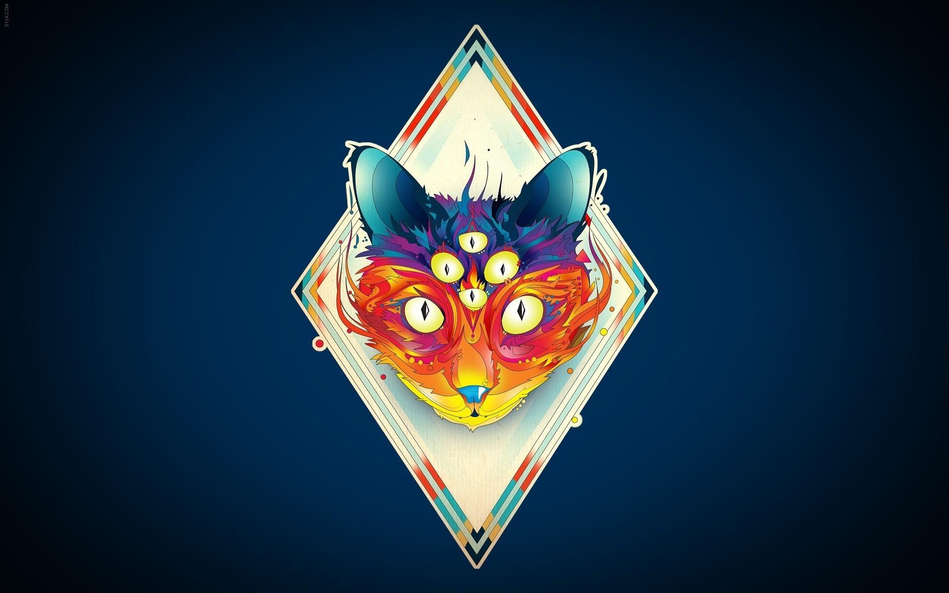 Description: A colorful fox head with eyes and a diamond pattern on it's face.