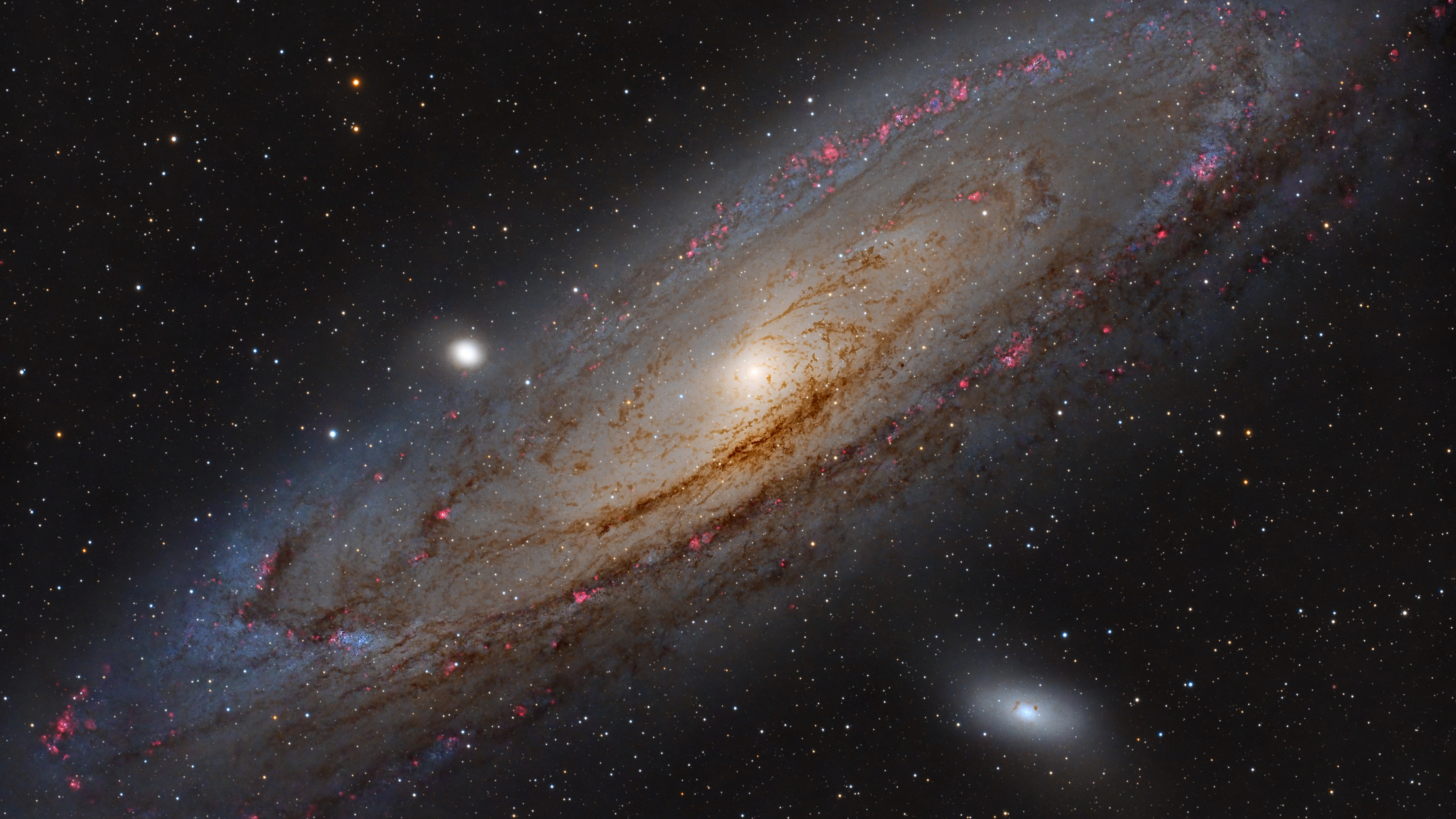 Description: A very large and colorful galaxy in the sky with stars around it and a bright light shining on the side of the galaxy.