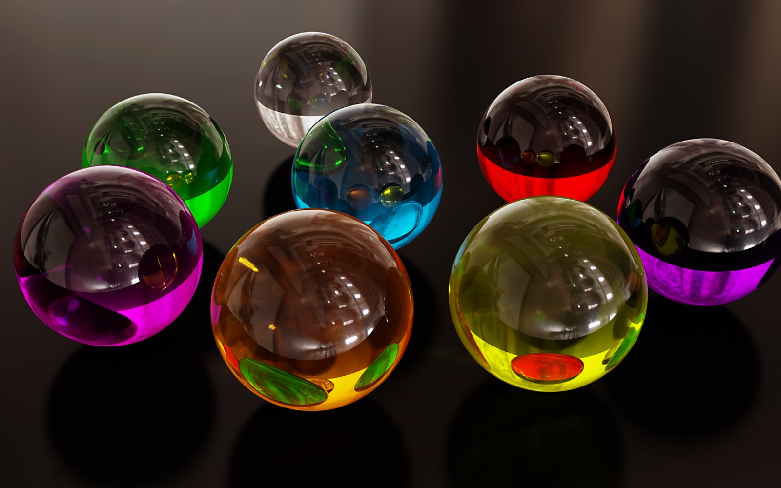 Description: A group of colorful glass balls sitting on top of a table next to each other on a black surface.
