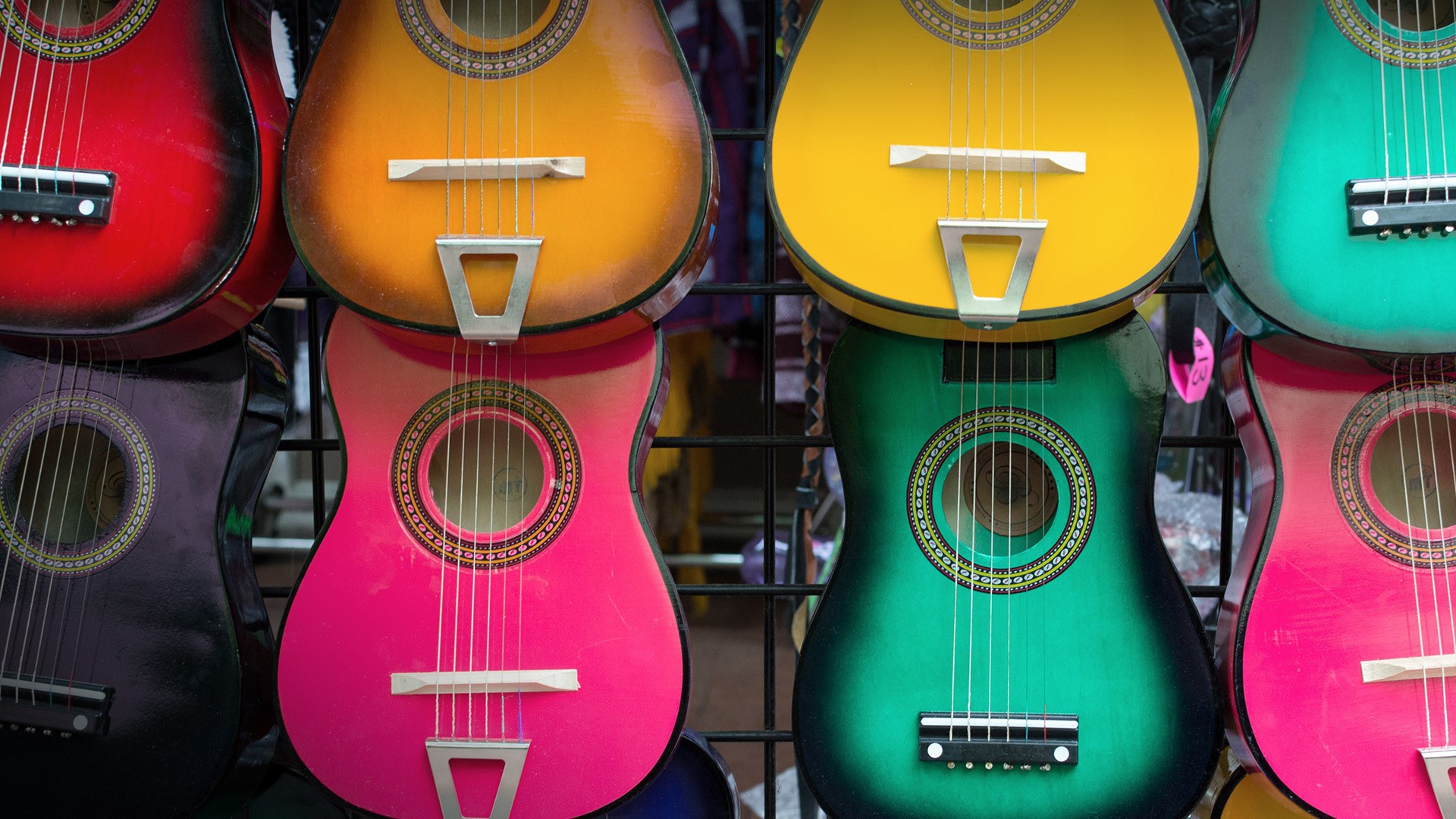 Description: A group of colorful guitars are stacked up together in a rack in a store window display case.