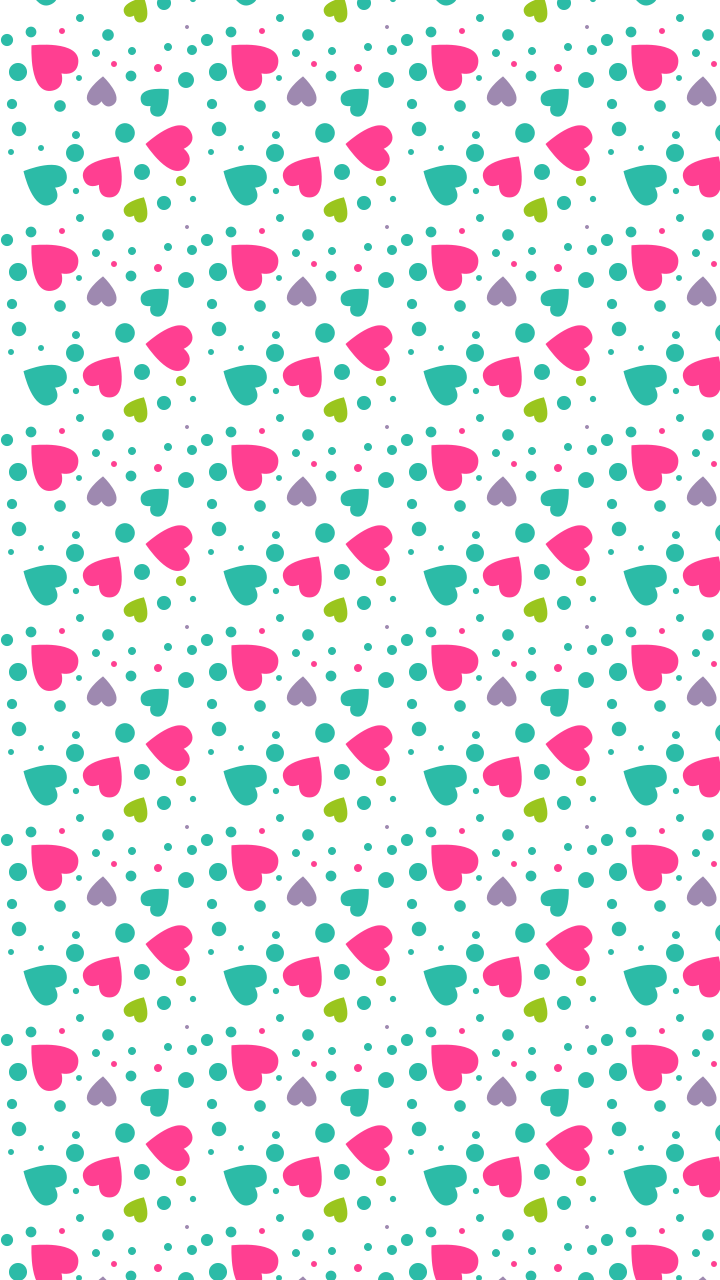 Description: A colorful pattern with hearts on a white background with polka dots and a green.