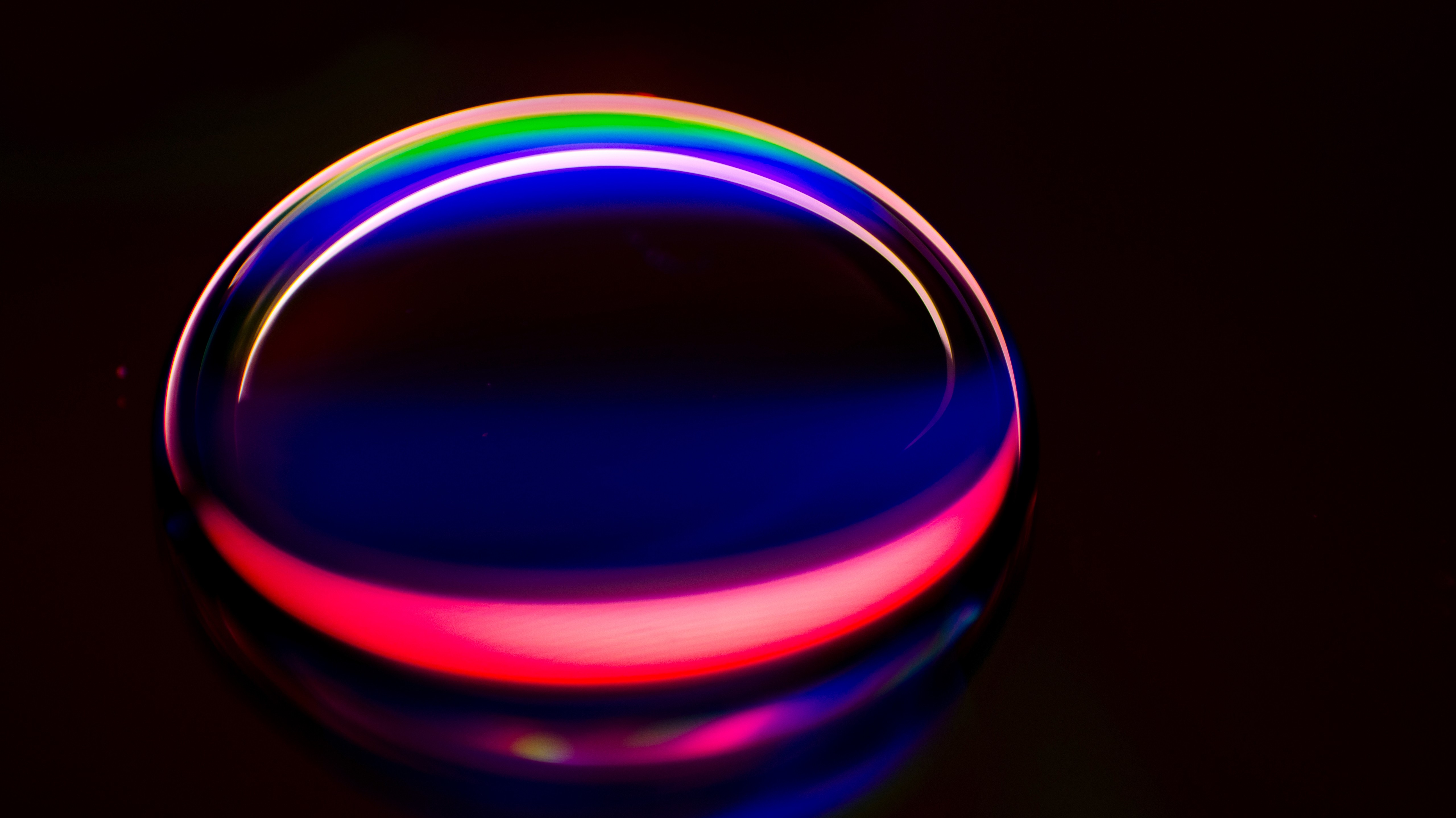 Description: A colorful object is shown in the dark with a black background and a red and blue circle in the center.