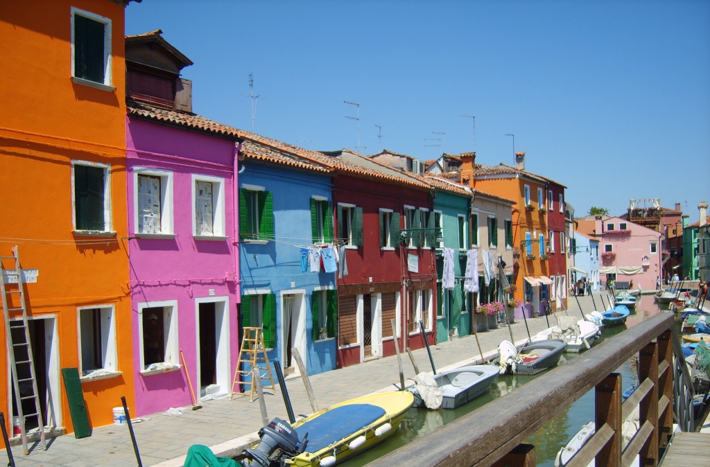 Description: A row of colorful houses along a river with boats parked on the side of the river and a bridge.