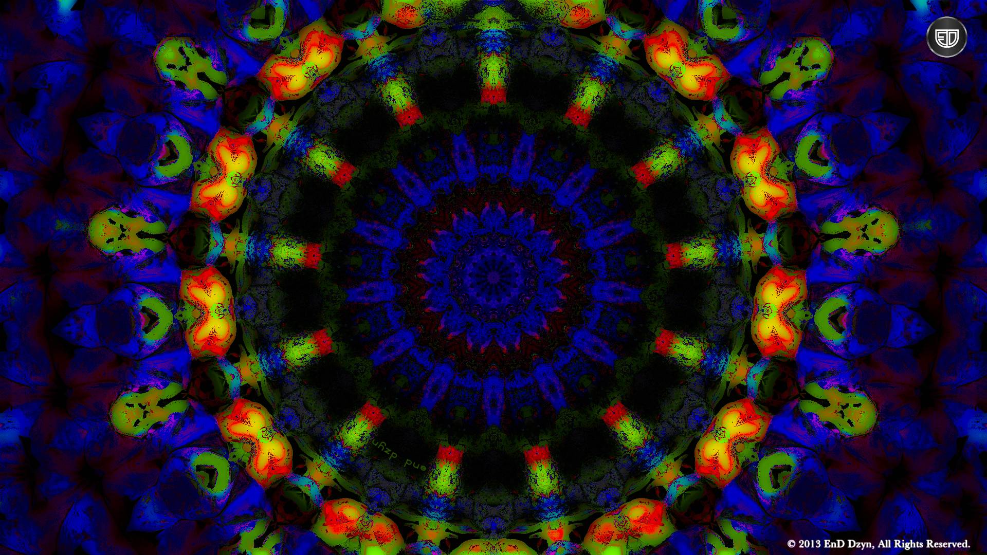 Description: A colorful kaleii design with a black background and a blue center and a red center and a green center.