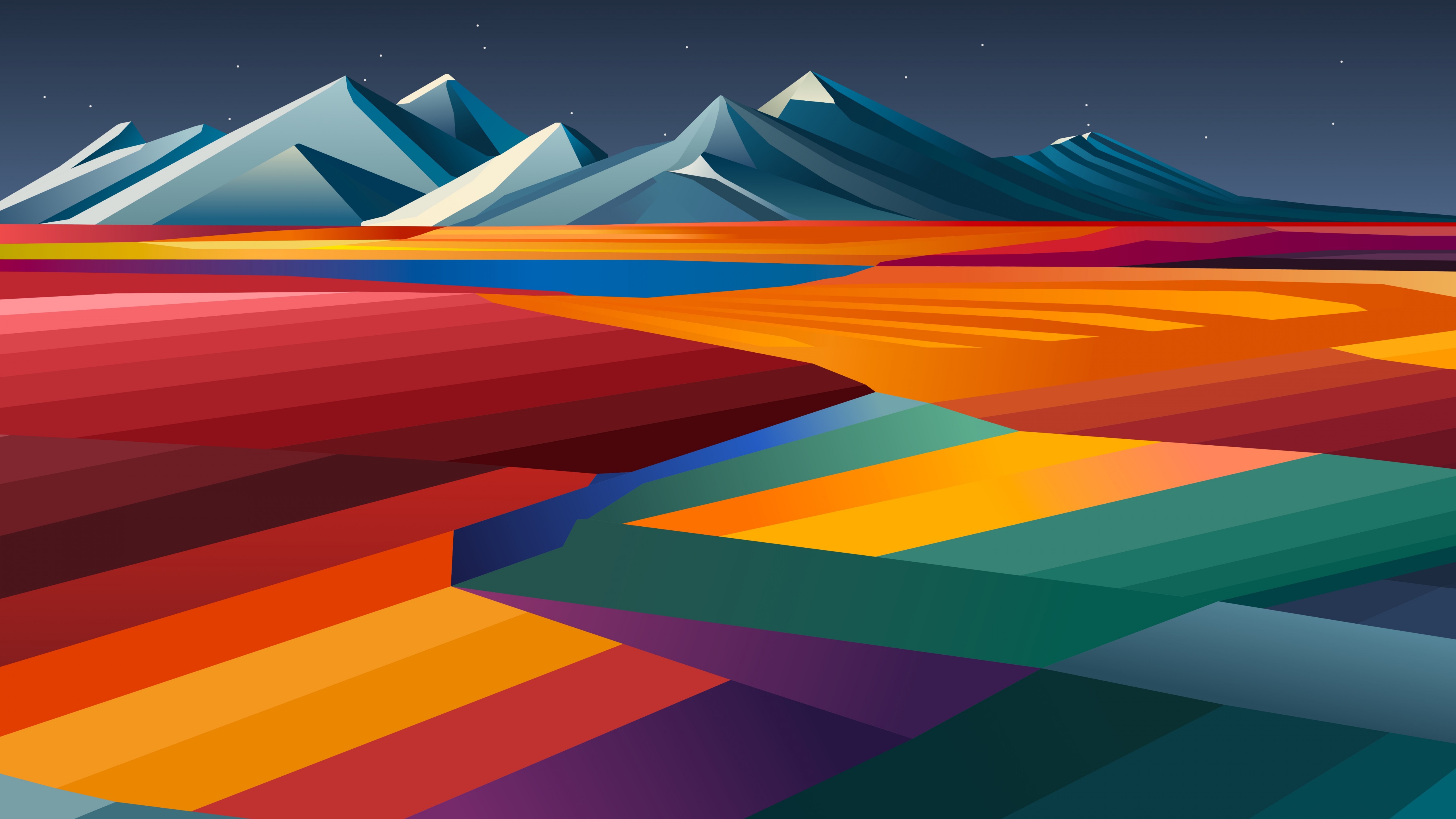 Description: A colorful landscape with mountains and a sky background that is very colorful and has a dark blue sky and stars.