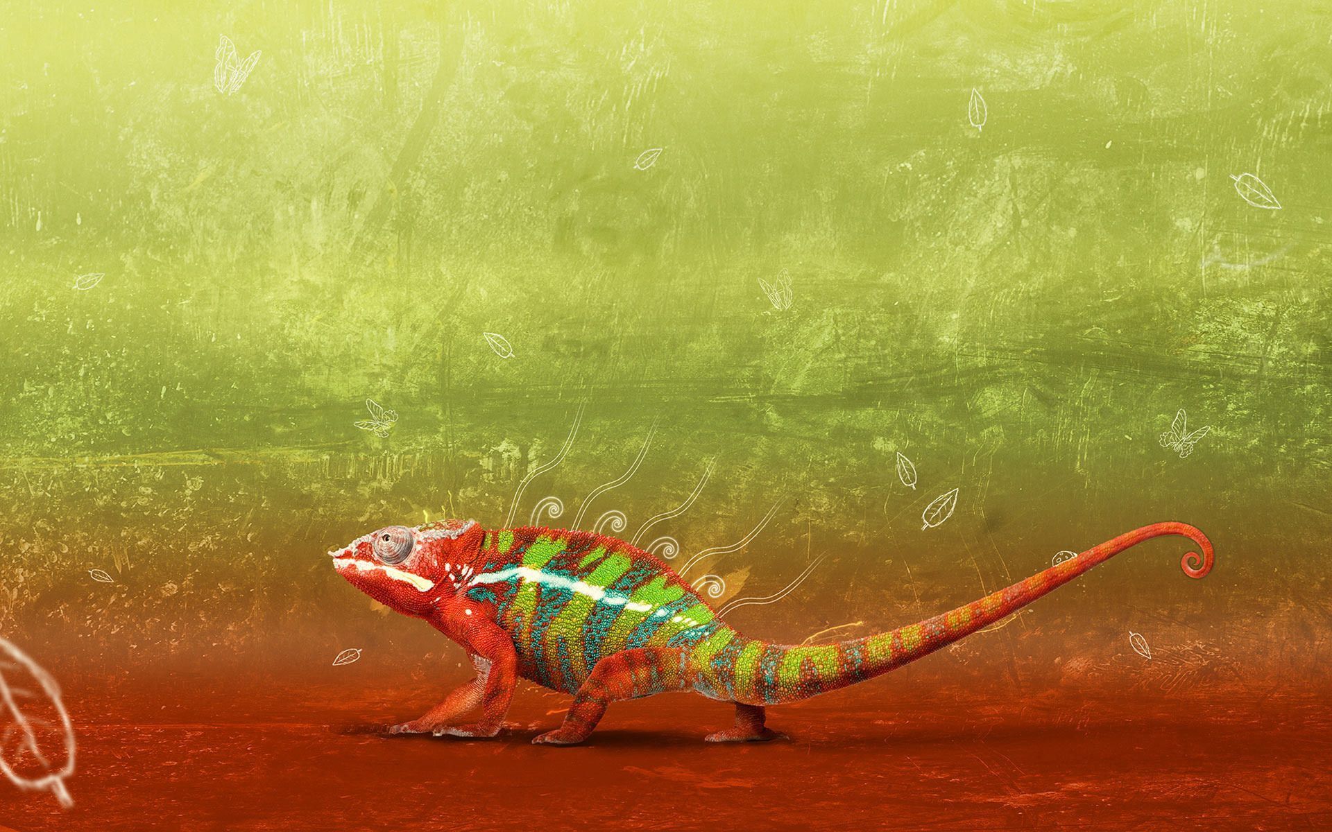 Description: A colorful lizard is standing on a red surface with a green background and a green and yellow background behind it.