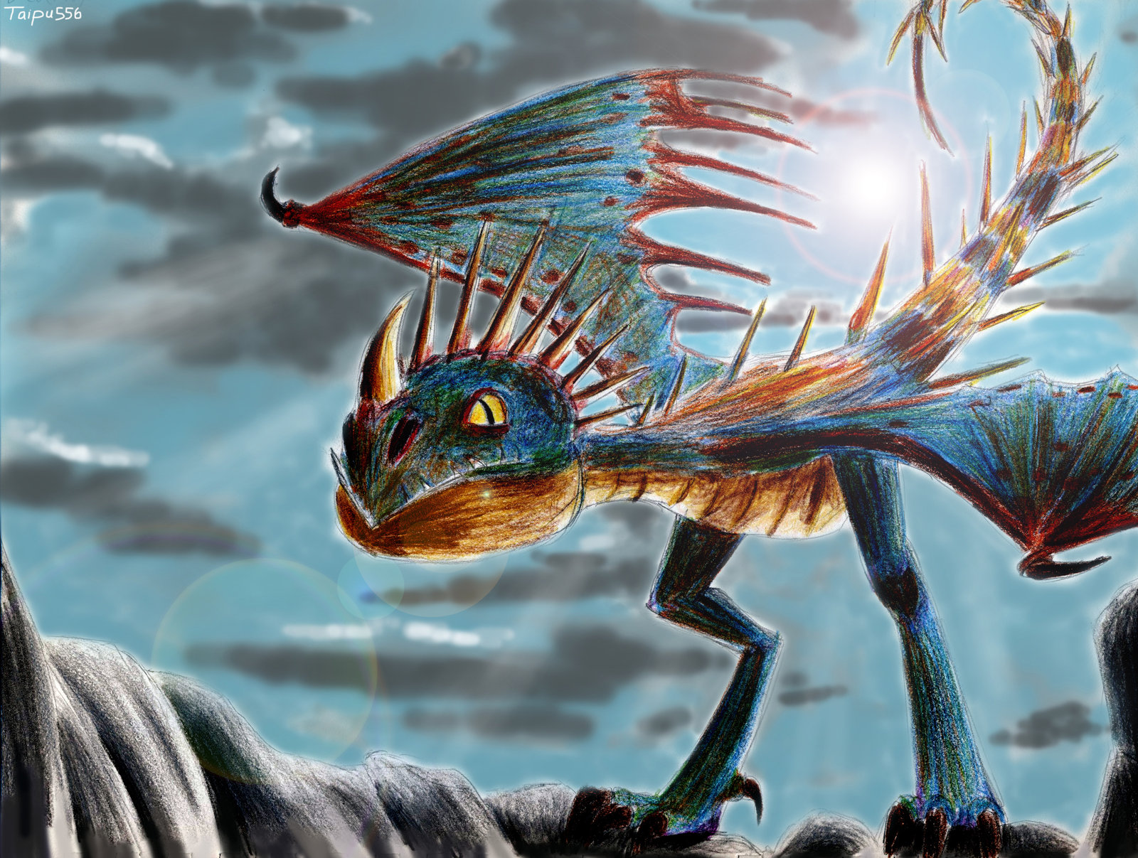 Description: A colorful lizard with wings on its back standing on a rock with a sky background and clouds in the background.