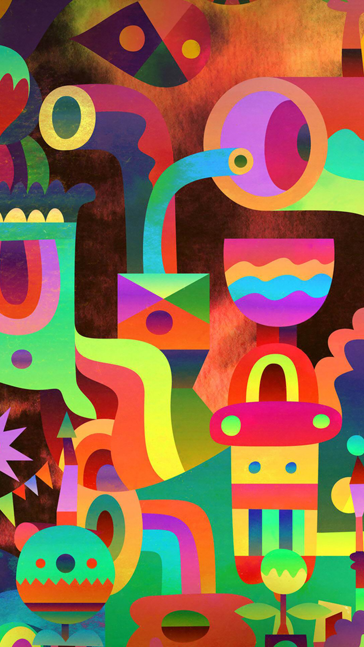 Description: A colorful painting of a group of monsters and a bird on a colorful background with a black background and a white border.
