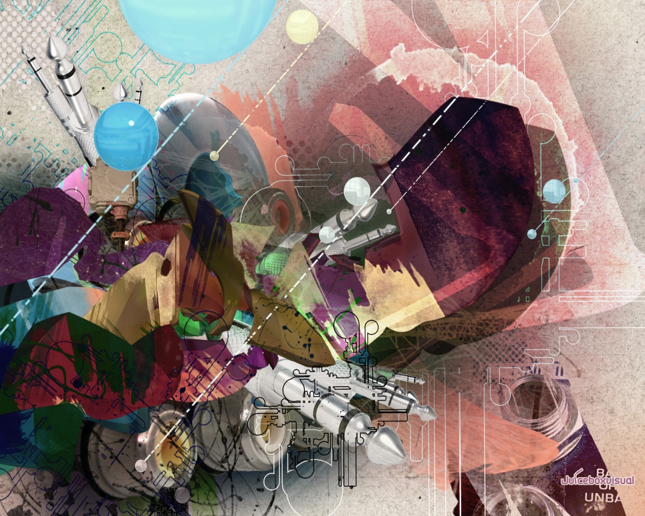 Description: A digital painting of a motorcycle with a lot of different colors and shapes on it's side and a blue ball in the middle.