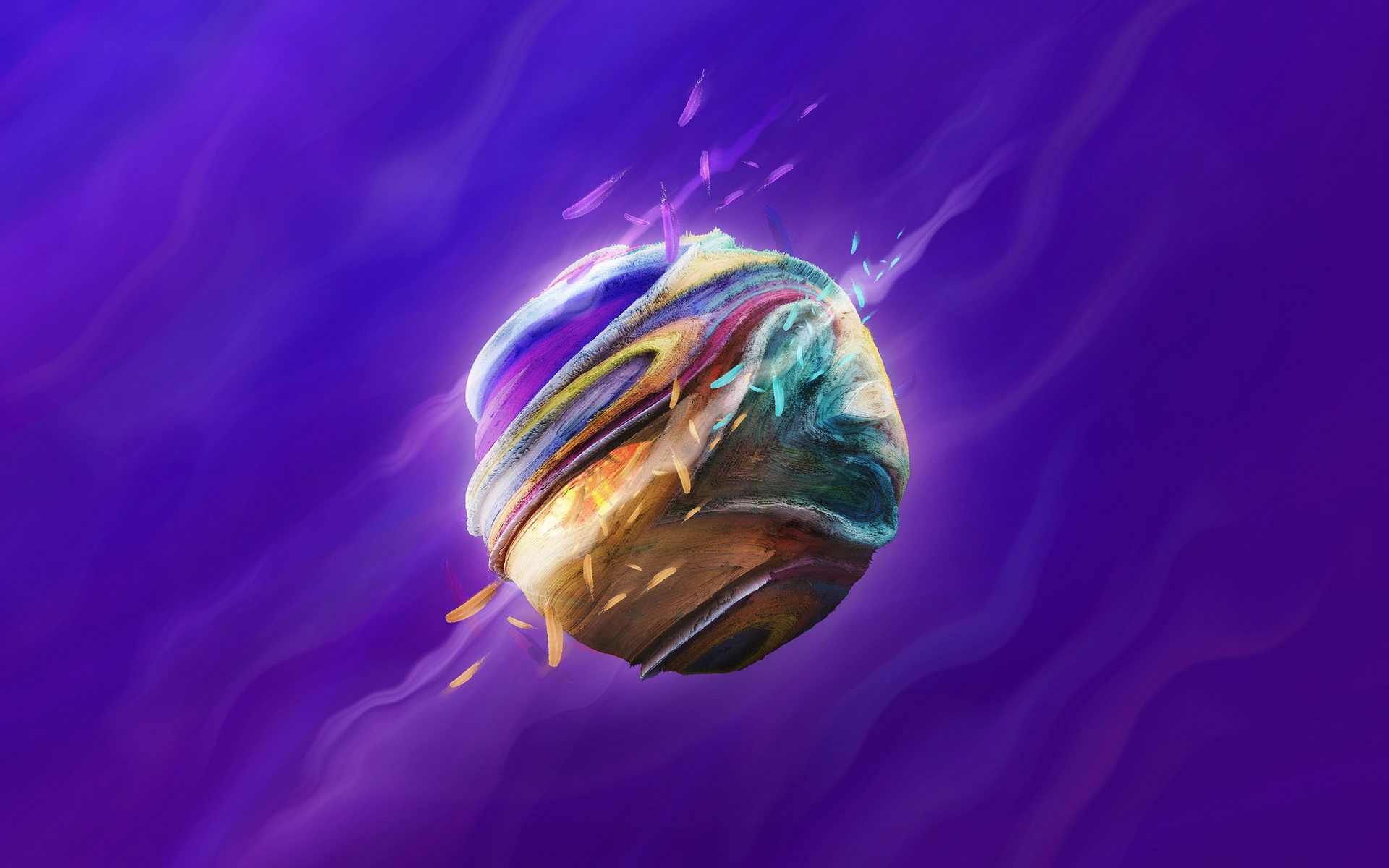 Description: A colorful object floating in the air on a purple background with a blue and purple swirl around it and a yellow and blue object.