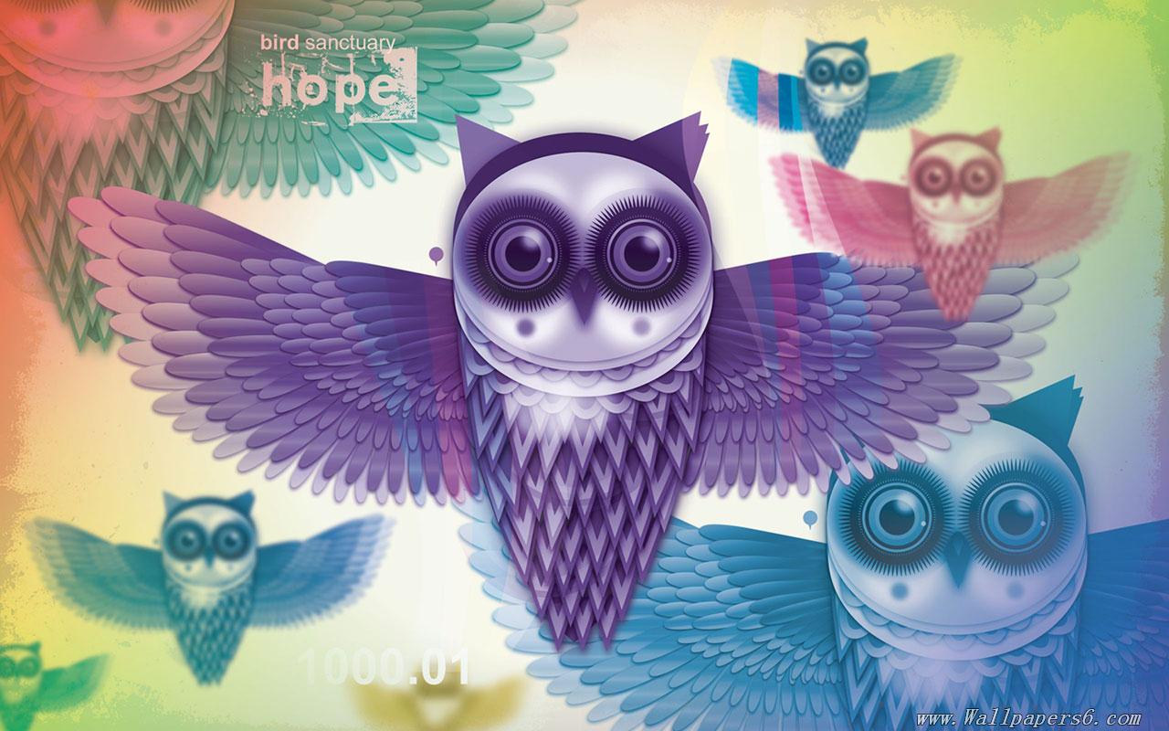 Description: A colorful owl with many different colors on it's wings and eyes.