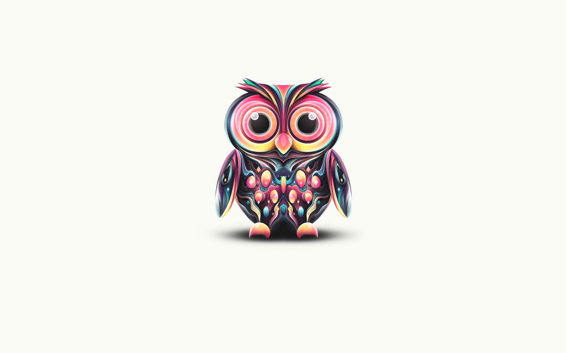 Description: A colorful owl sitting on top of a white surface with a white background and a black outline on the bottom.