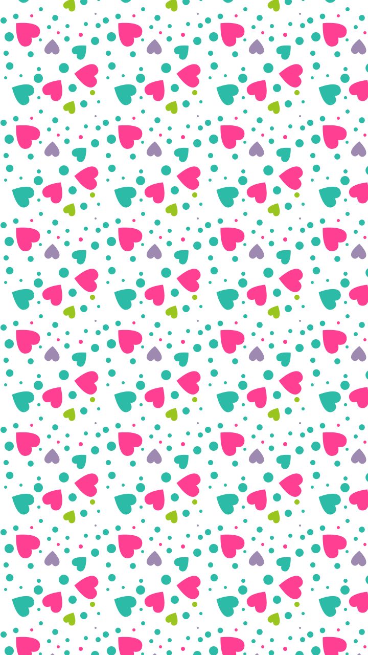 Description: A colorful pattern with hearts on a white background with polka dots and a green.