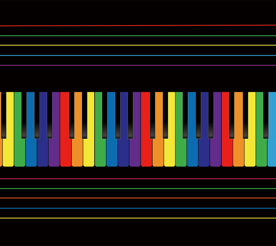 Description: A colorful piano keyboard with a black background and a rainbow stripe in the middle of the keyboard is a black background.