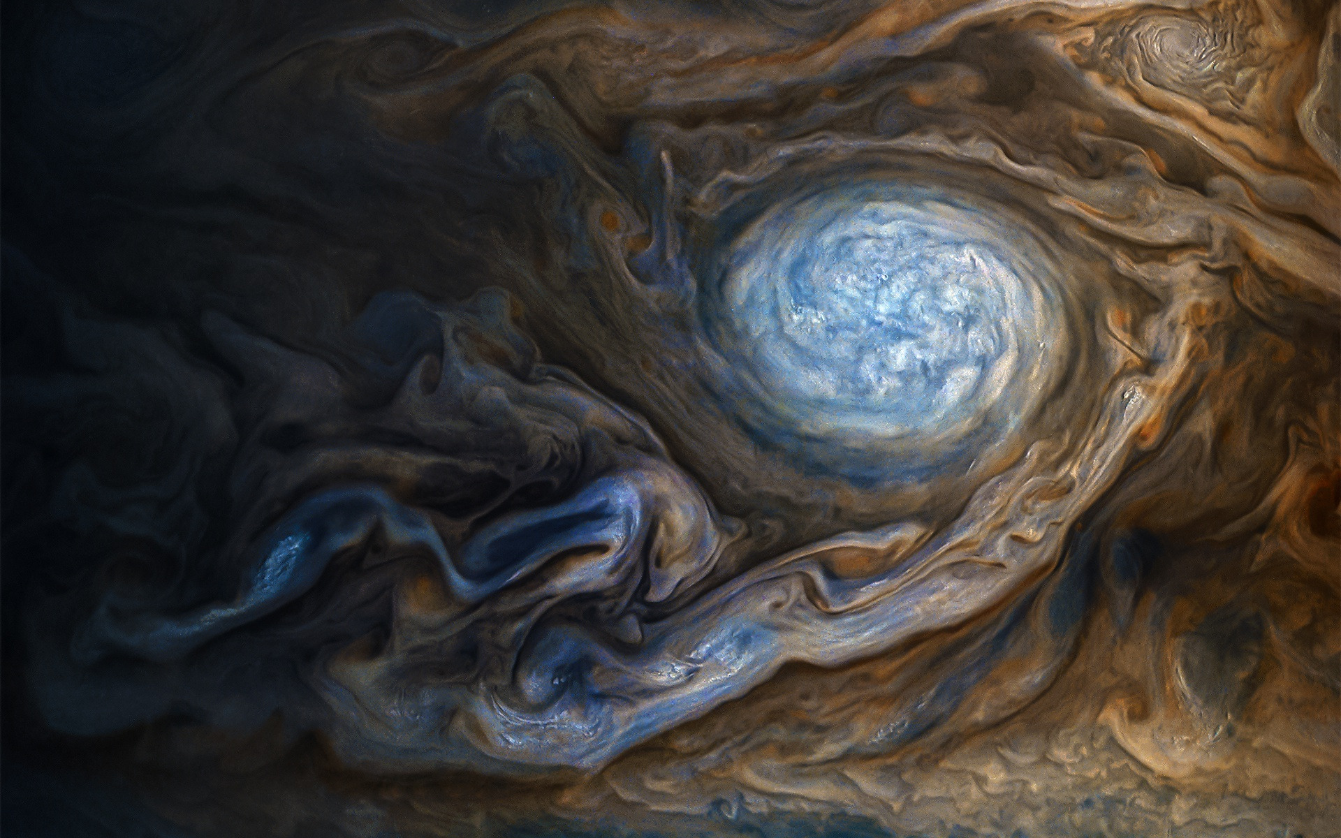 Description: A very large and colorful object in the sky with a lot of clouds on it's surface and a blue center.