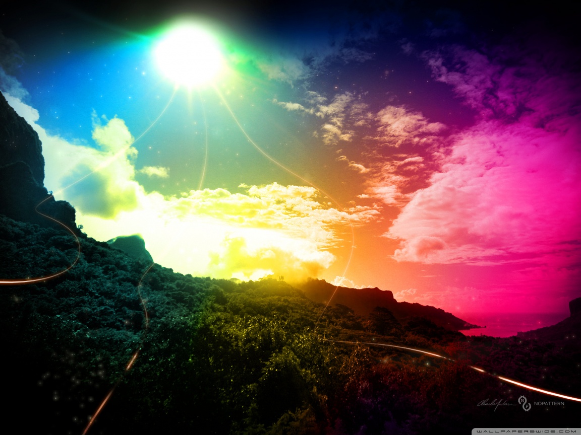 Description: A colorful sky with clouds and a rainbow colored sun in the middle of it and a mountain in the background.
