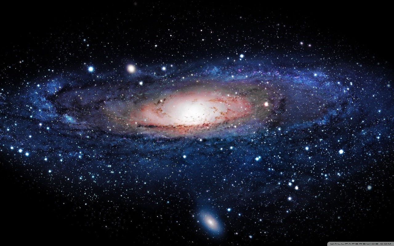 Description: A very large and colorful spiral galaxy with stars in the background and a black background with a blue center.