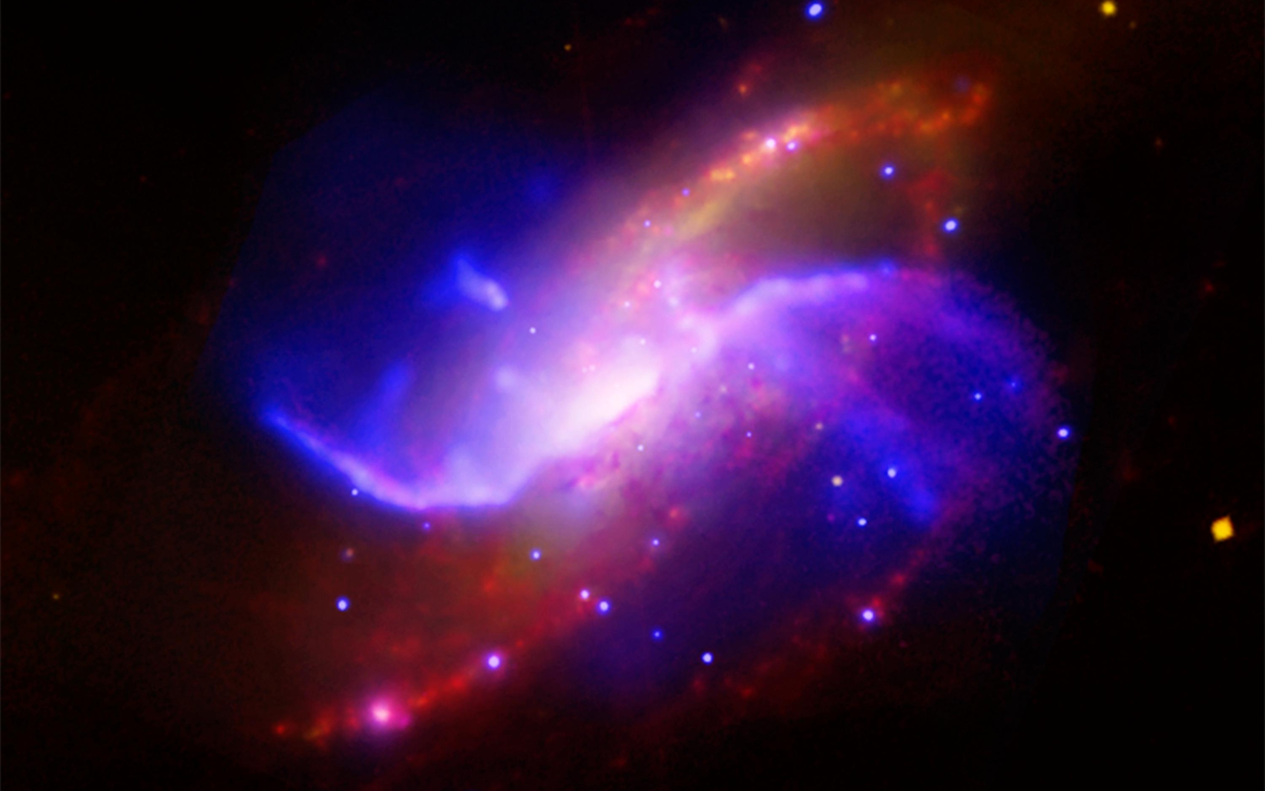 Description: A very colorful spiral shaped object in the dark sky with stars around it and a blue light in the middle.
