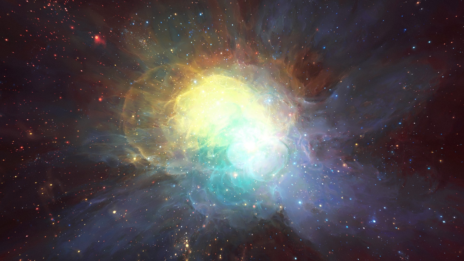 Description: A colorful star cluster in the middle of a space filled with stars and dust.