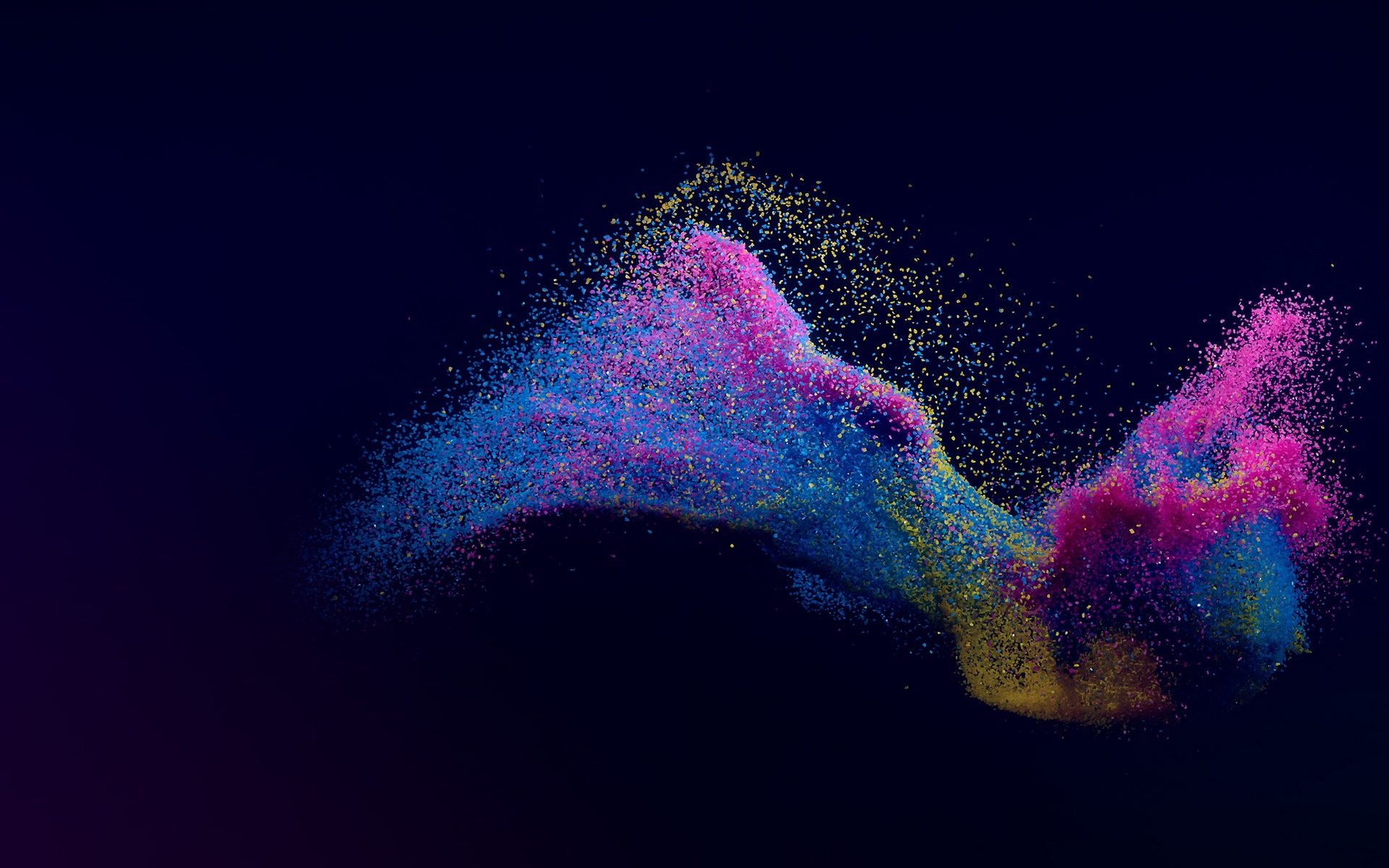 Description: A colorful substance is flying through the air with a dark background and a blue sky behind it.
