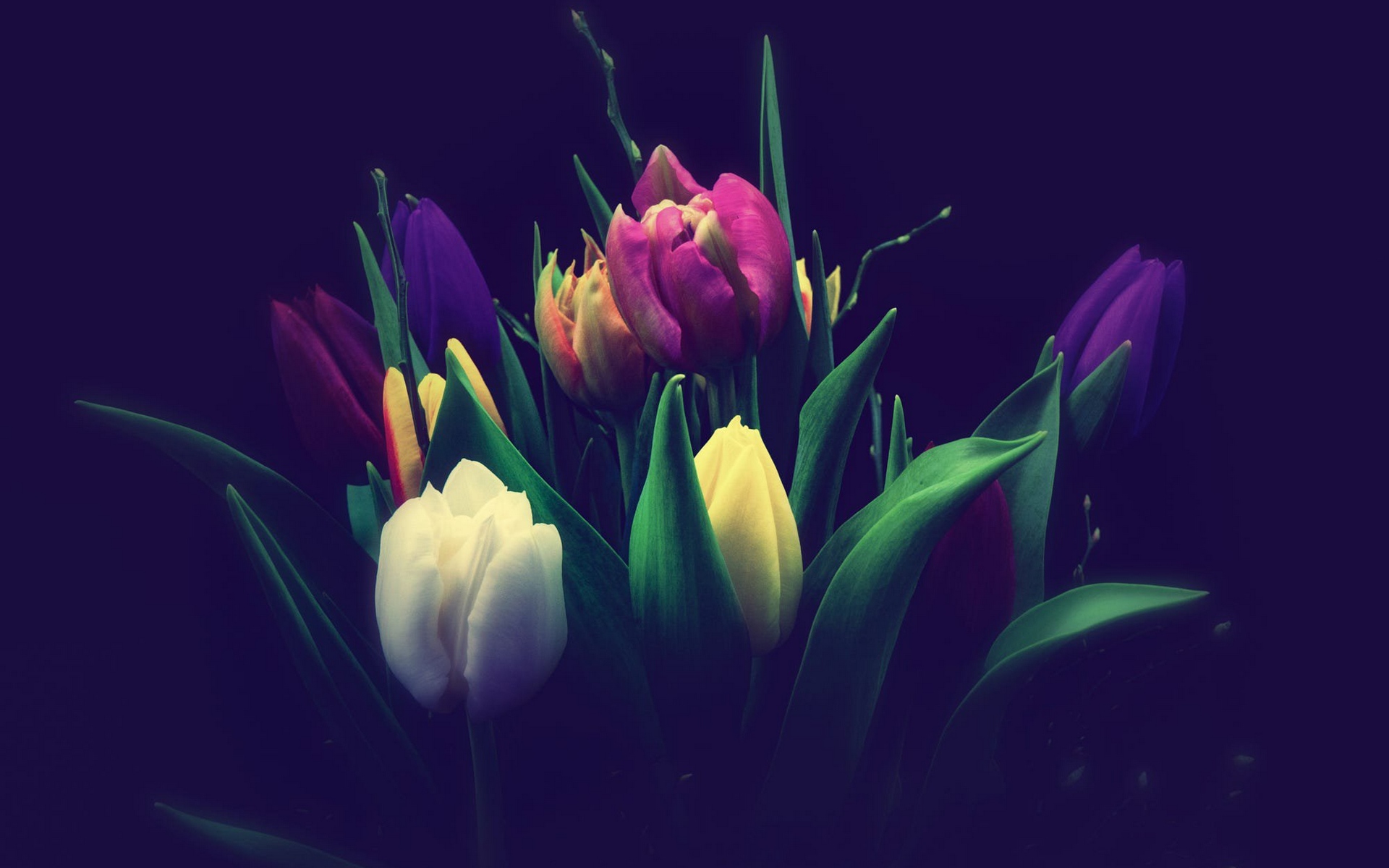 Description: A bunch of colorful tulips are in a vase on a table top.