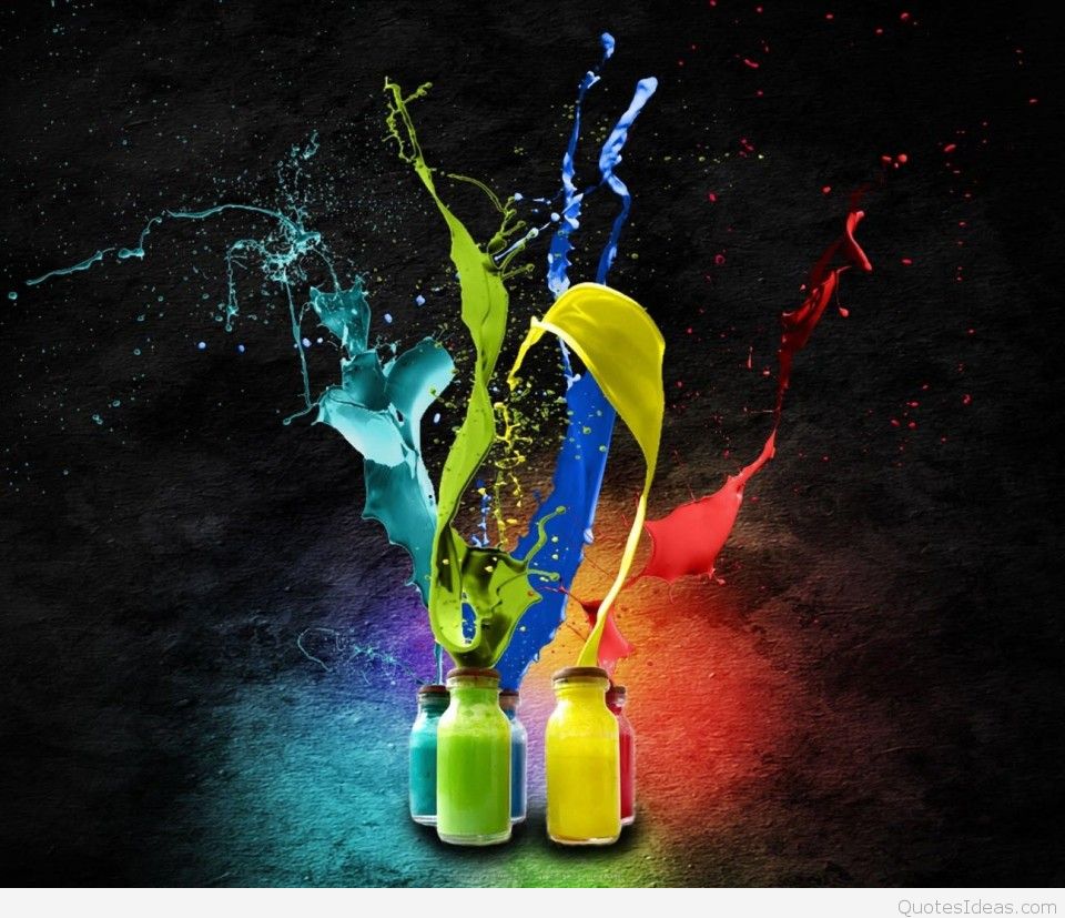 Description: A group of three colorful vases with liquid pouring out of them on a black background with a splash of paint.