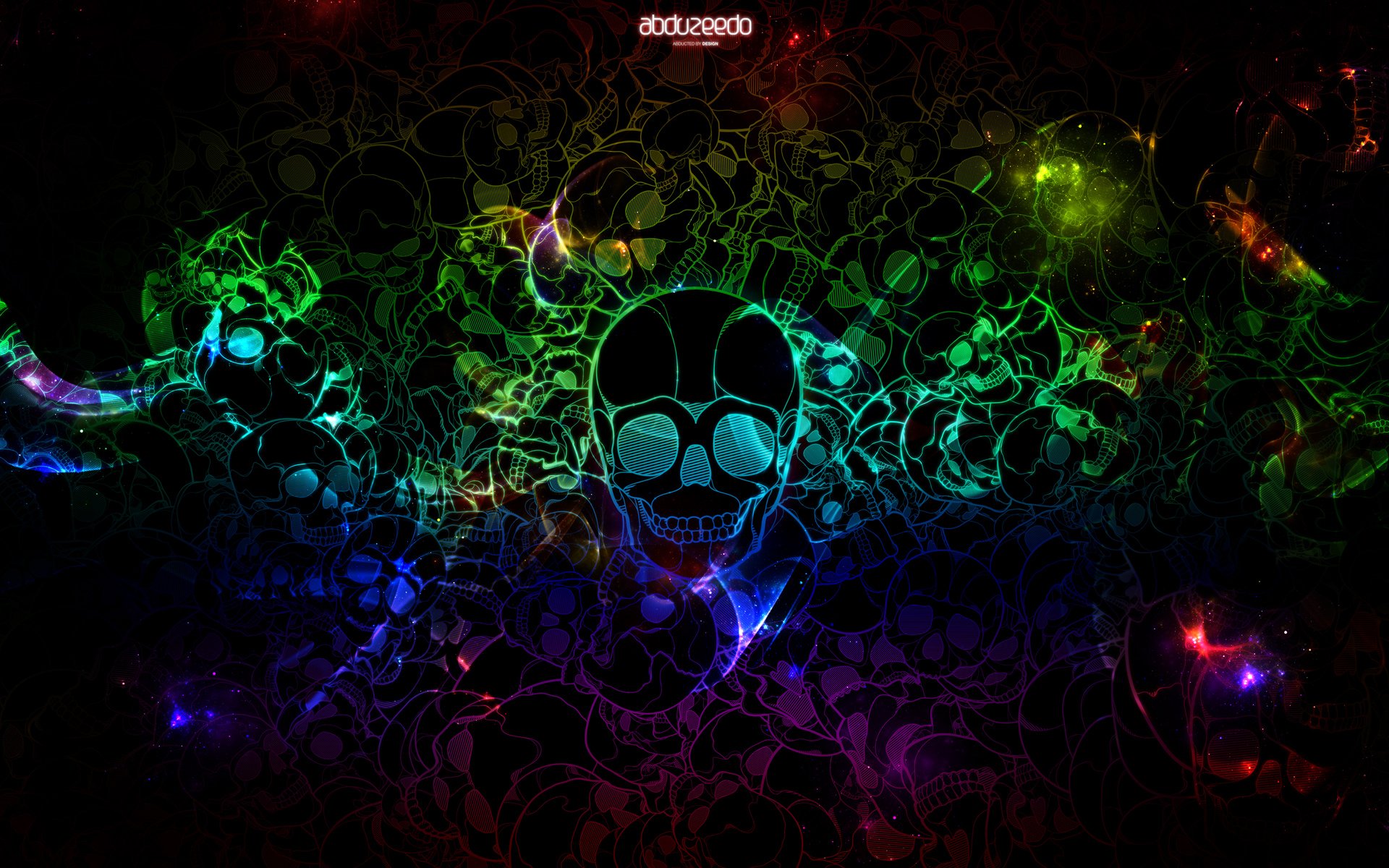 Description: A colorful wall with a skull on it's side and a neon light behind it that is lit up.