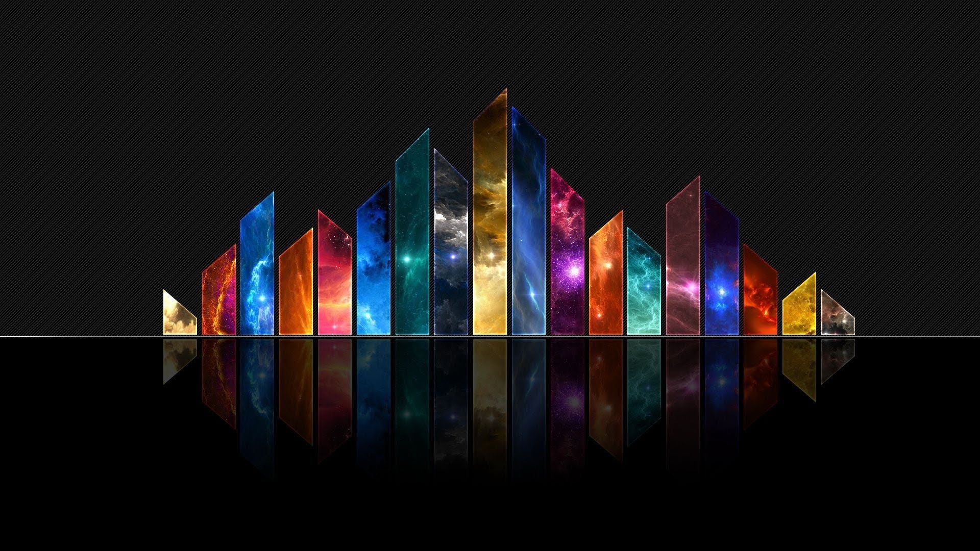 Description: A colorful wallpaper with a black background and a reflection of a building in the water with a reflection of the building.