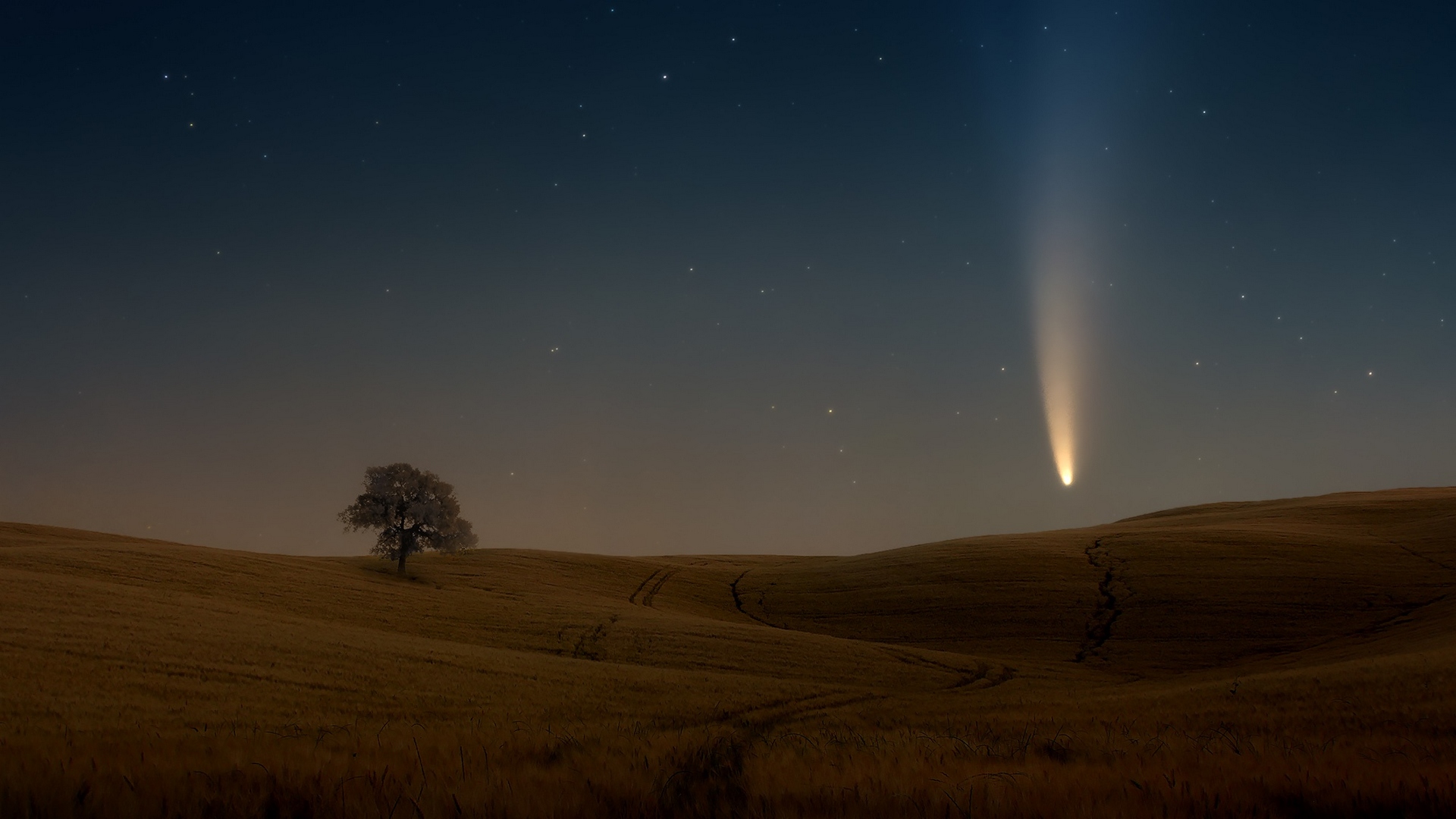 Description: A long exposure of a comet and a tree in a field at night time with a bright light streak.