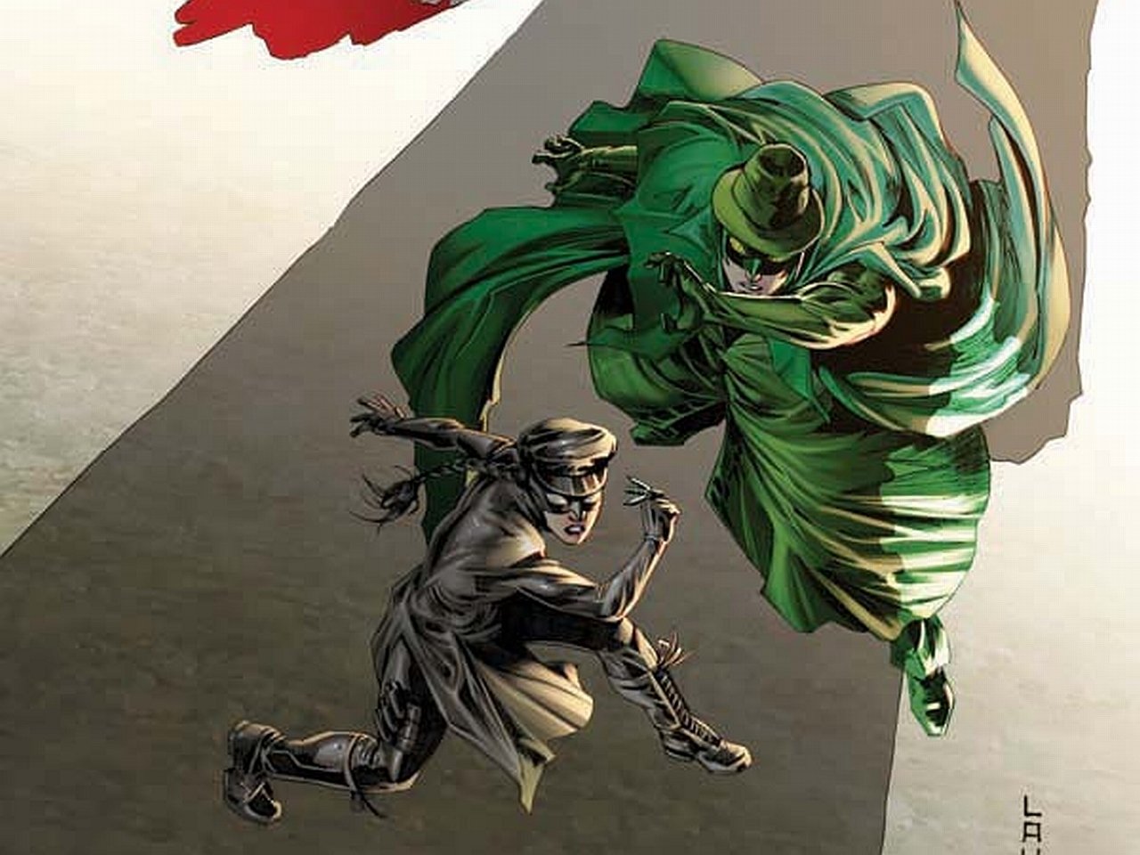Description: A comic book cover with a woman running behind a man in a green cape and a red cloak on his head.