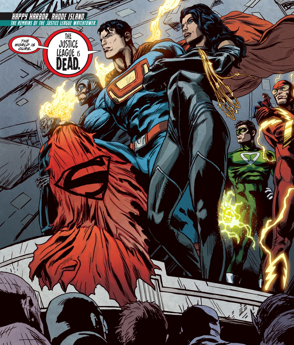 Description: A comic book cover with a group of people in the background and a comic book title above the image.