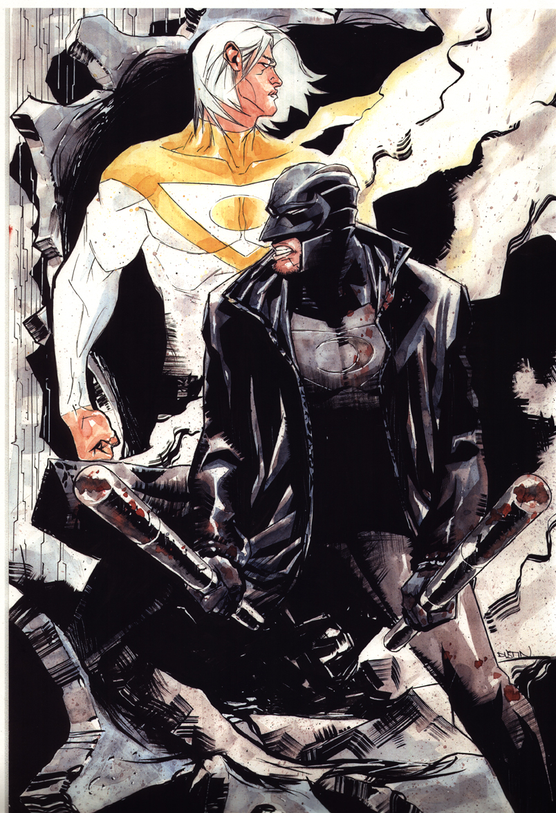 Description: A comic book cover with a man and a woman in black and white outfits and a yellow shirt and a black and white background.