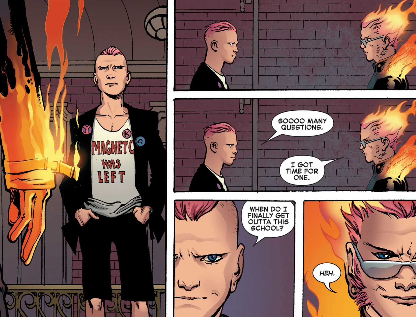 Description: A comic strip with a man holding a fire extinguisher in his hand and a man in a suit and tie with a t - shirt on.