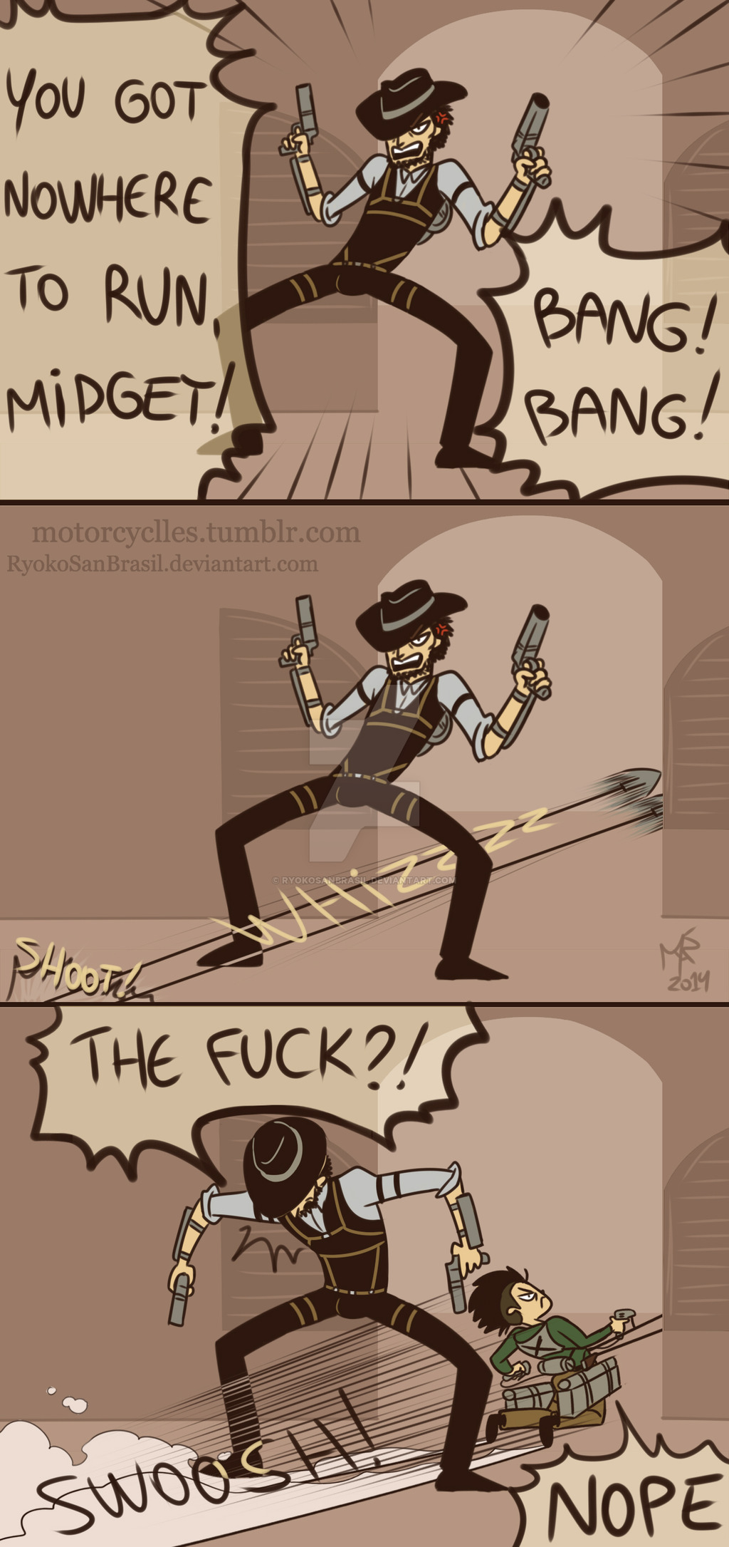 Description: A comic strip with a man holding a gun and another cartoon character holding a gun and another comic strip with a man holding a gun.