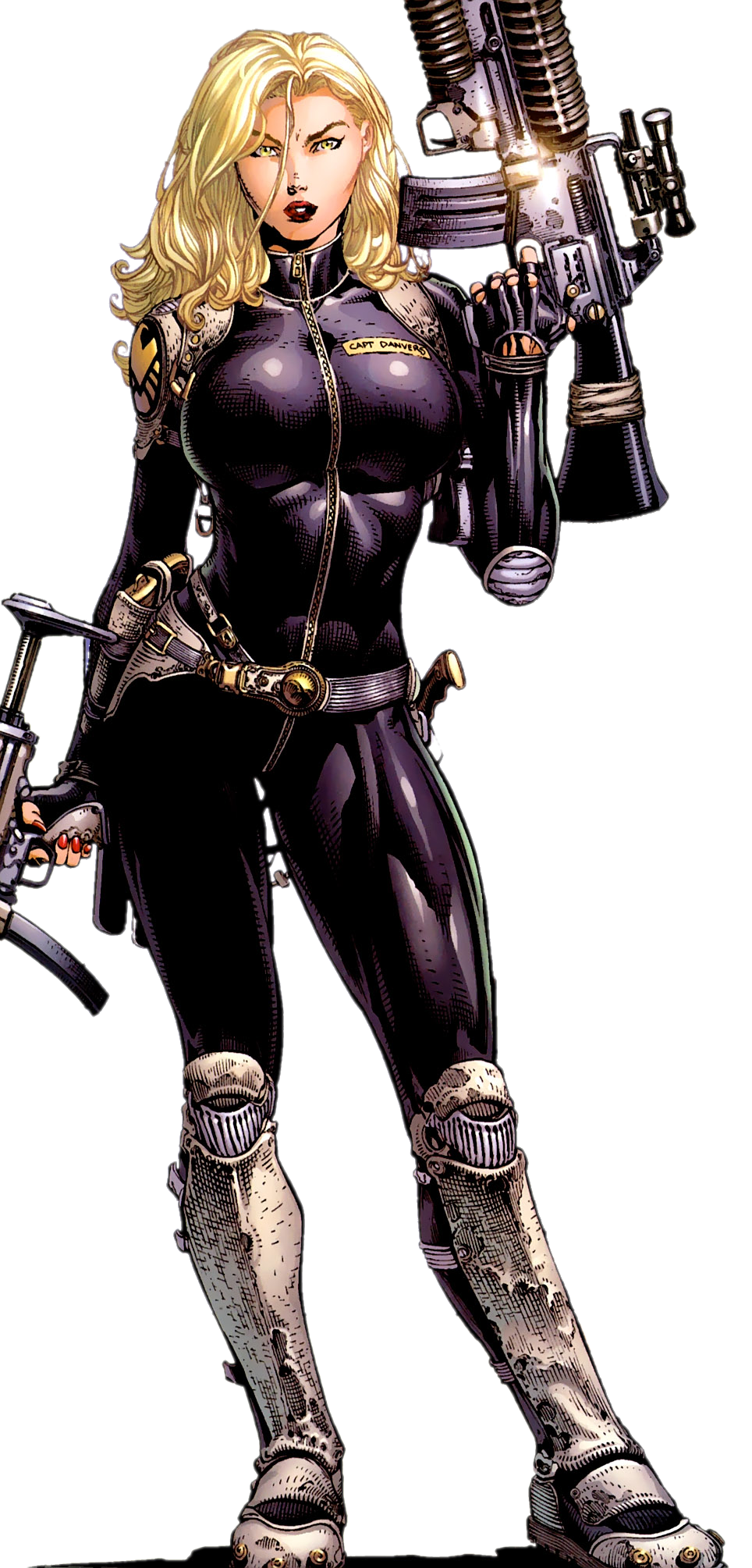 Description: A comic strip with a woman in a black outfit holding a gun and a gun in her hand and a man in a red shirt and a red shirt.